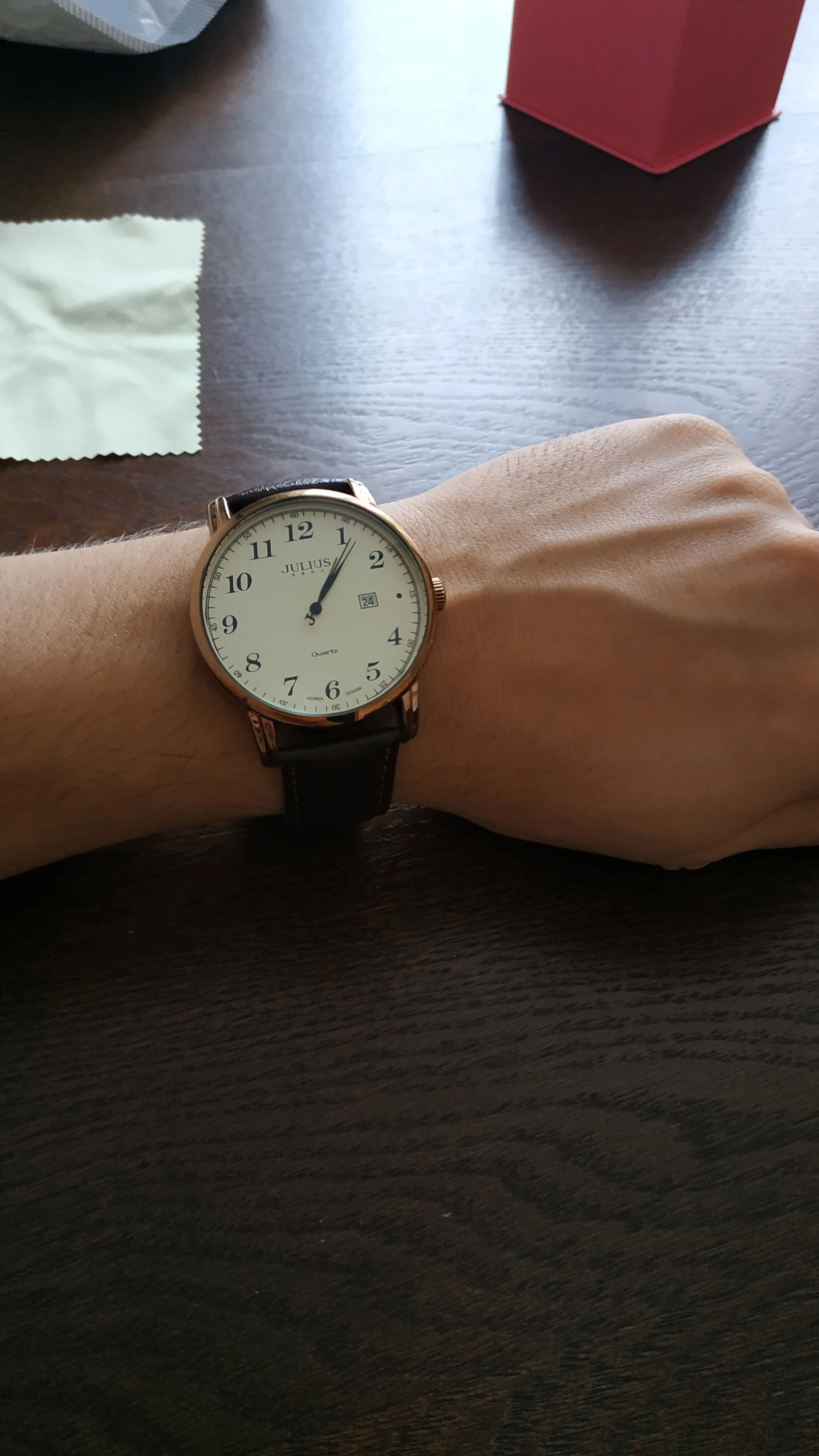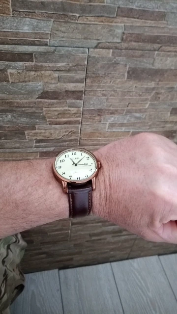 вообщем доставка быстро .часы классические качественные мне понравились .золотистый цвет с красноватым оттенком более тёмный чем на фото .Но это не критично.ремешок короткий впритык .на толстое запястье не подойдёт.работают чётко все функции . советую кому понравится.
