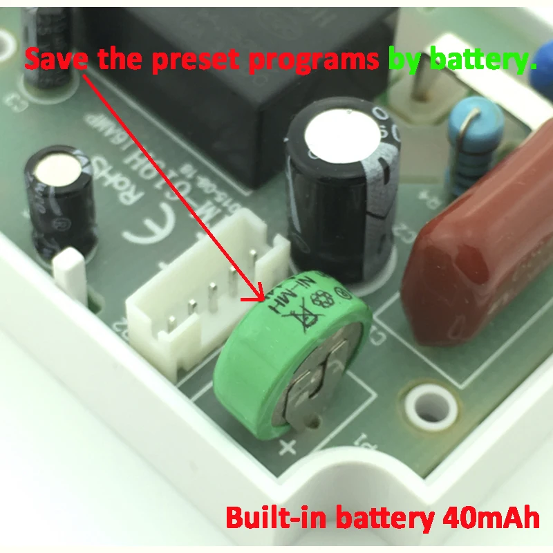 Таймер может открывать или закрывать виды электрических приборов и питания автоматически, в соответствии с заданным временем, элементы могут быть уличные фонари, nion свет (знак), афиша, электрические приборы, трансляции оборудованием и т. д., цифровой таймер переключатель находится в пределах многоразовых перезаряжающихся батарей, обеспечивает в 1,2 V/40Ma, высокой точности CMOS Чип, сильно, анти-помех Простой в использовании.