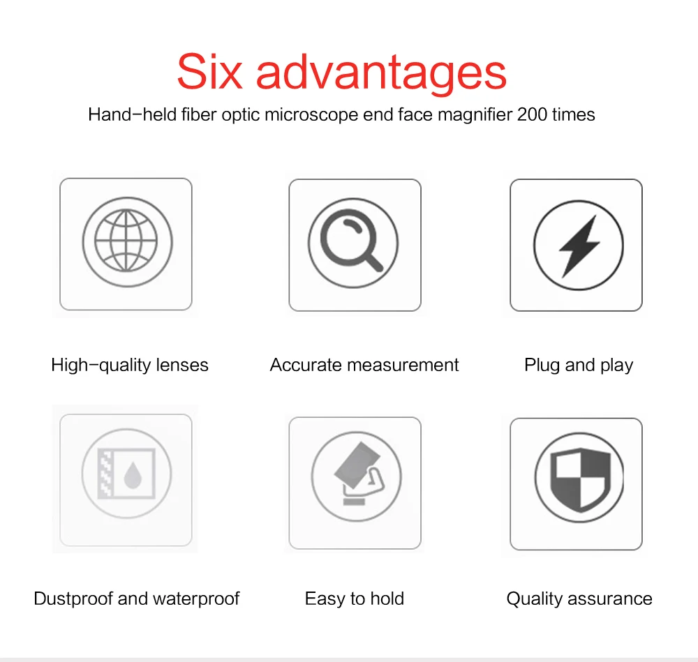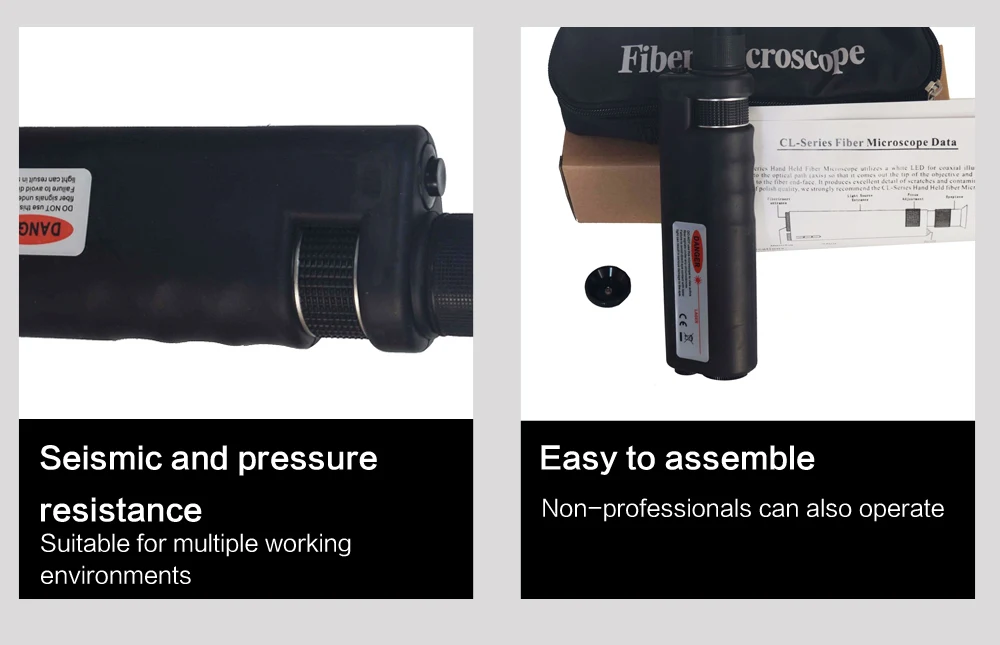Этот полевой волоконный микроскоп также является недорогим и высококачественным инструментом для проверки волокон, который доступен с увеличением 400X, а белый светодиодный светильник может обеспечить коаксиальное освещение для концевой поверхности соединителя. Это система высокого разрешения, чтобы увидеть детали царапин, дефектов и загрязнений с помощью метода освещения. Этот микроскоп в основном используется на месте.Портативный и простой в использовании, это идея для поданных операций;Оптический разъем: 2,5 мм Универсальный адаптер переменного тока, 1,25 мм Универсальный адаптер;Специализированный дизайн для защиты зрения.