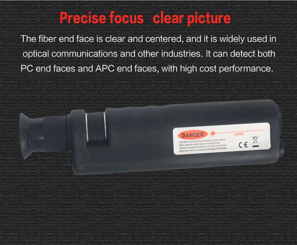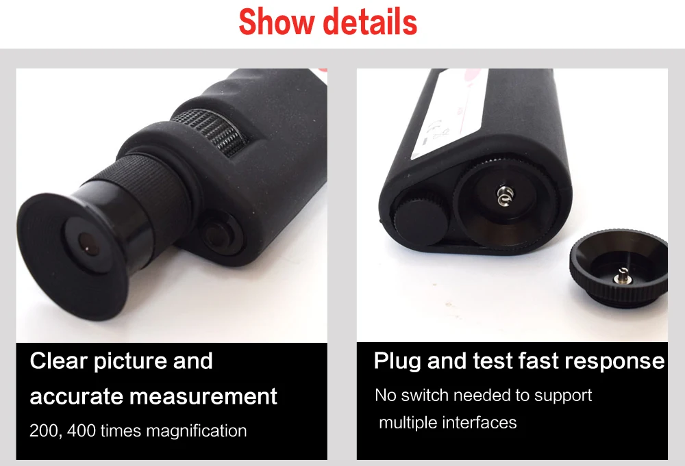 400XПортативный волоконный микроскоп может быстро проверить впадины, царапины, загрязнения и другие условия на FC/SC/LC волоконно-оптические перемычки/свиной хвост, изображение волоконного конца очень четкое, применяется для оптоволоконной связи и других отраслей промышленности. Продукт ценится многими пользователями из-за его низких цен, хорошего качества, рентабельности. В то же время, это также важное оборудование для проверки волокон для оператора/инженерных подрядчиков, которые занимаются полевыми операциями и работой по техническому обслуживанию лазерной печати/платного производства.
