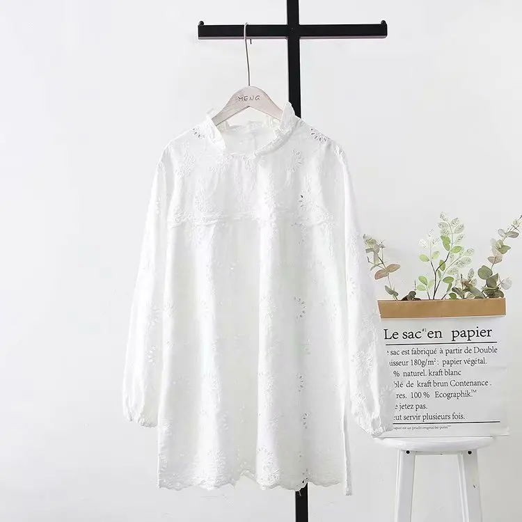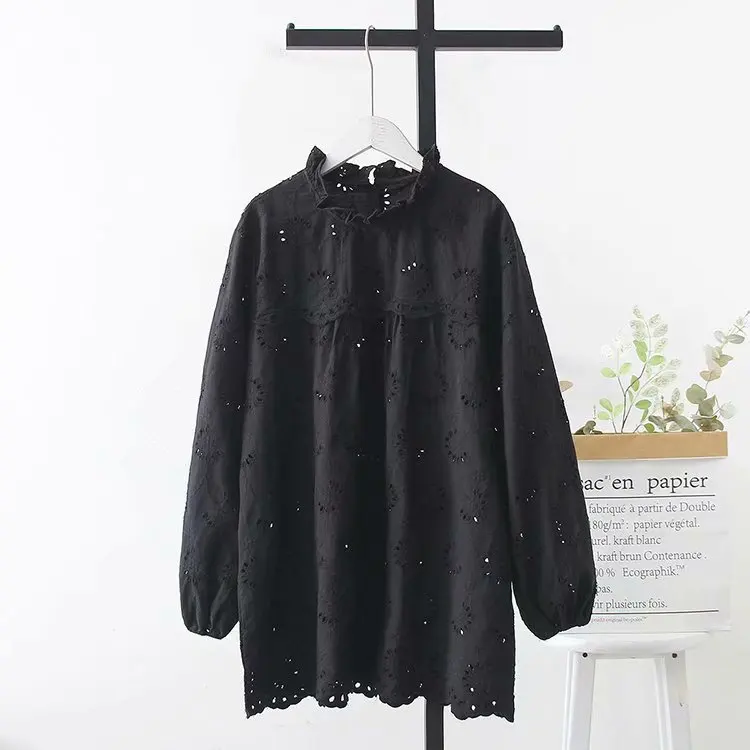 Женская ажурная блузка KYQIAO, белая и черная однотонная Элегантная блузка большого размера с воротником-стойкой и длинным рукавом, 2020