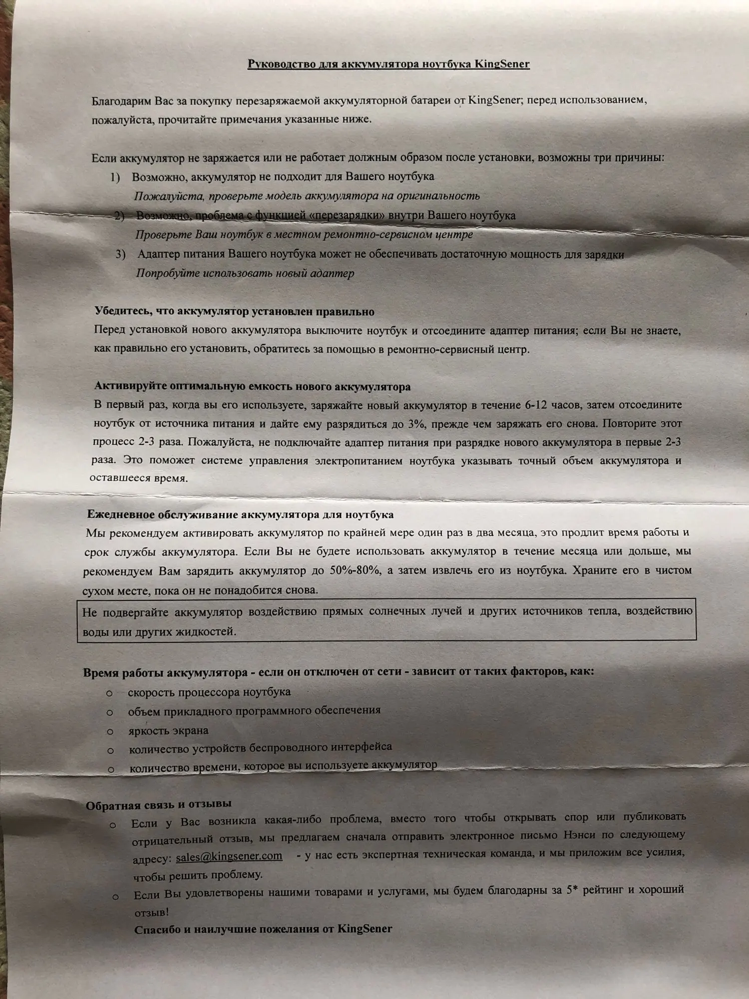 Самая ужасная доставка! Посылка была в пути 90 дней! При чём 80 дней была в Китае! Только после открытия спора пошло движение. И это называется - ускоренная доставка! Сама батарея подошла. Надеюсь прослужит долго.