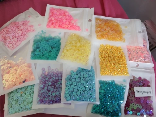EVERYTHING from this seller is a winner. I’m always blown away by the quality of these sequins. You can really tell the difference between a sequin mix made up of sequins from this store and a sequin mix made up of sequins from a regular craft store. I’m over the moon with the purchase. I also got a freebie with my order: a little bag with green sequins (not a colour I would’ve chosen but pretty anyway). Thank you!!!