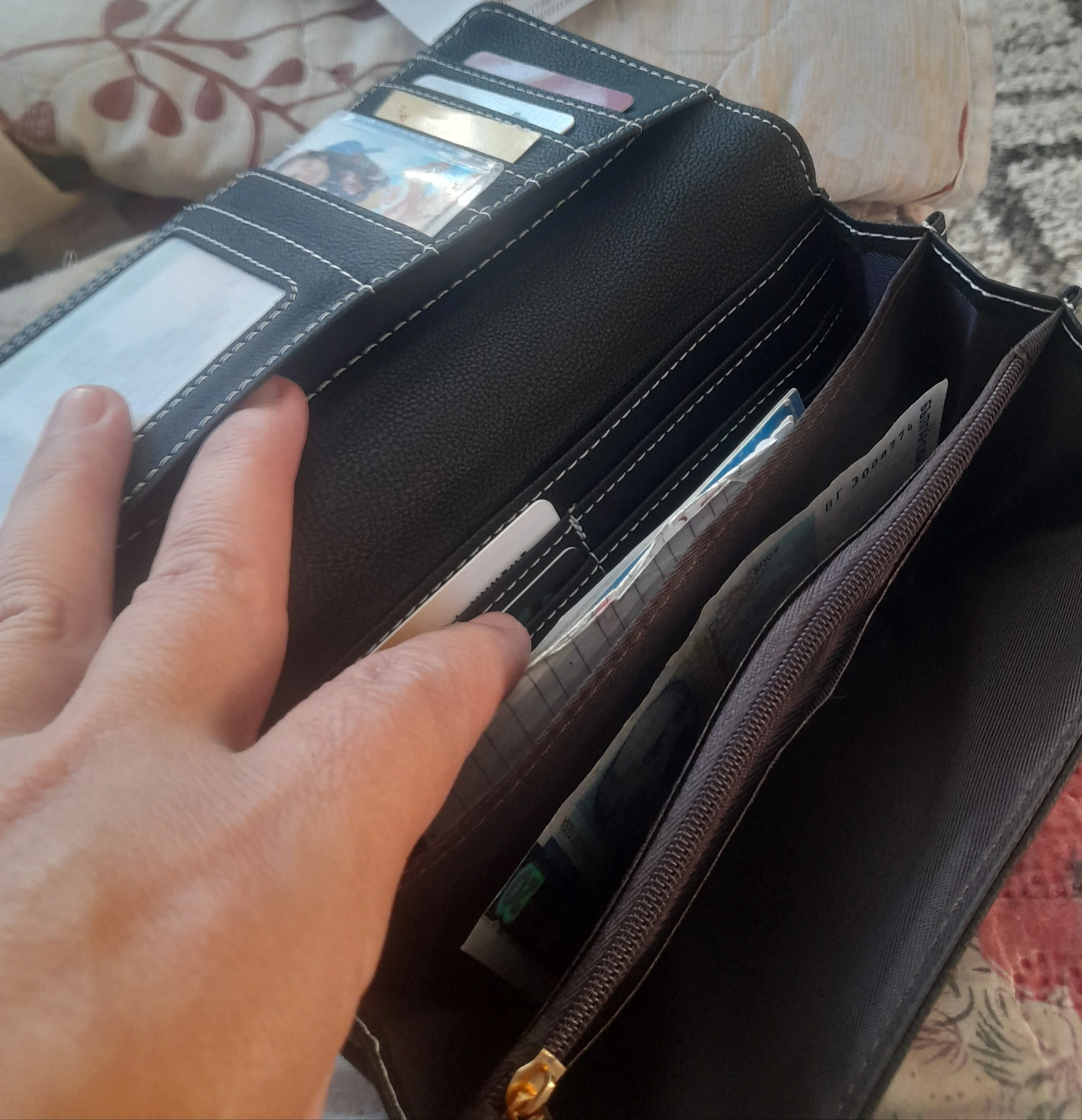 Кошелёк очень интересный, для меня удобный, в руку ложится поместится всё. я довольна товаром и продавцом.
