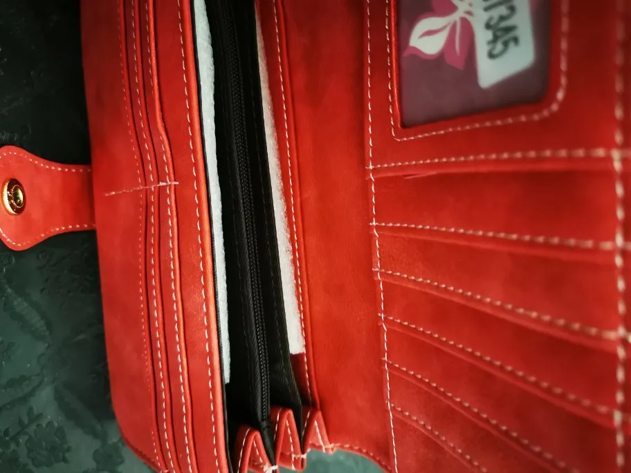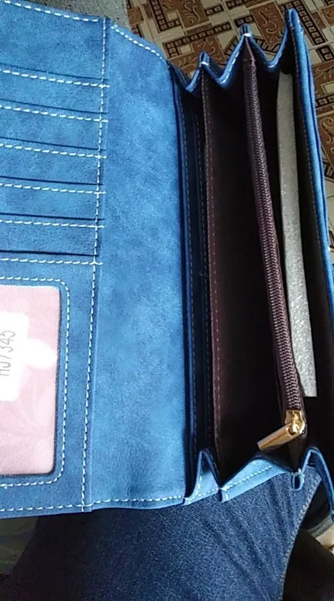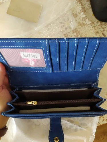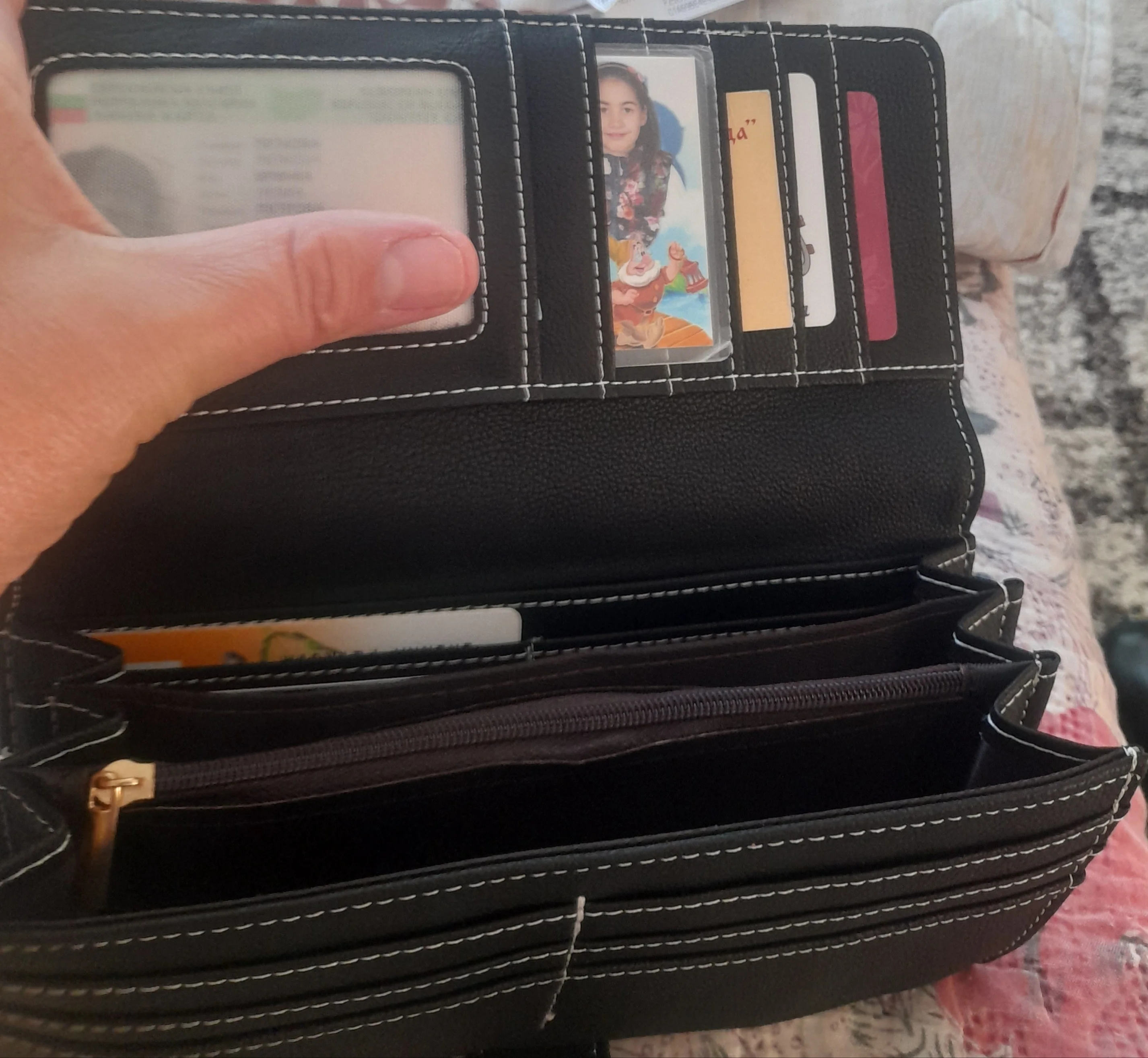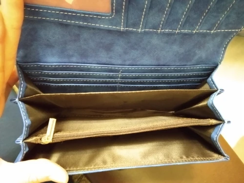 Кошелёк очень понравился. 19 отделов под карточки, кармашек для мелочи на замочке, 3 отдела для бумажных денег, а самое главное 3 потайных кармашка для заначки. Клёпка держится хорошо. На ощупь очень приятный, тёплый, мягенький, не бархатный, похож на кожаный. С продавцом не общалась, заказ пришёл в течении месяца
