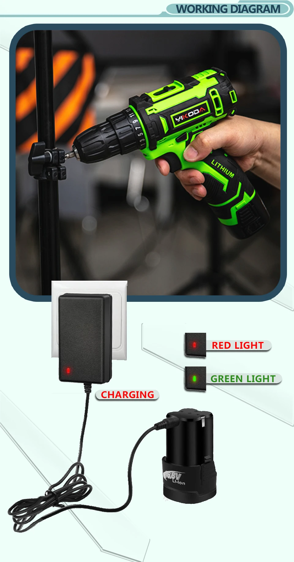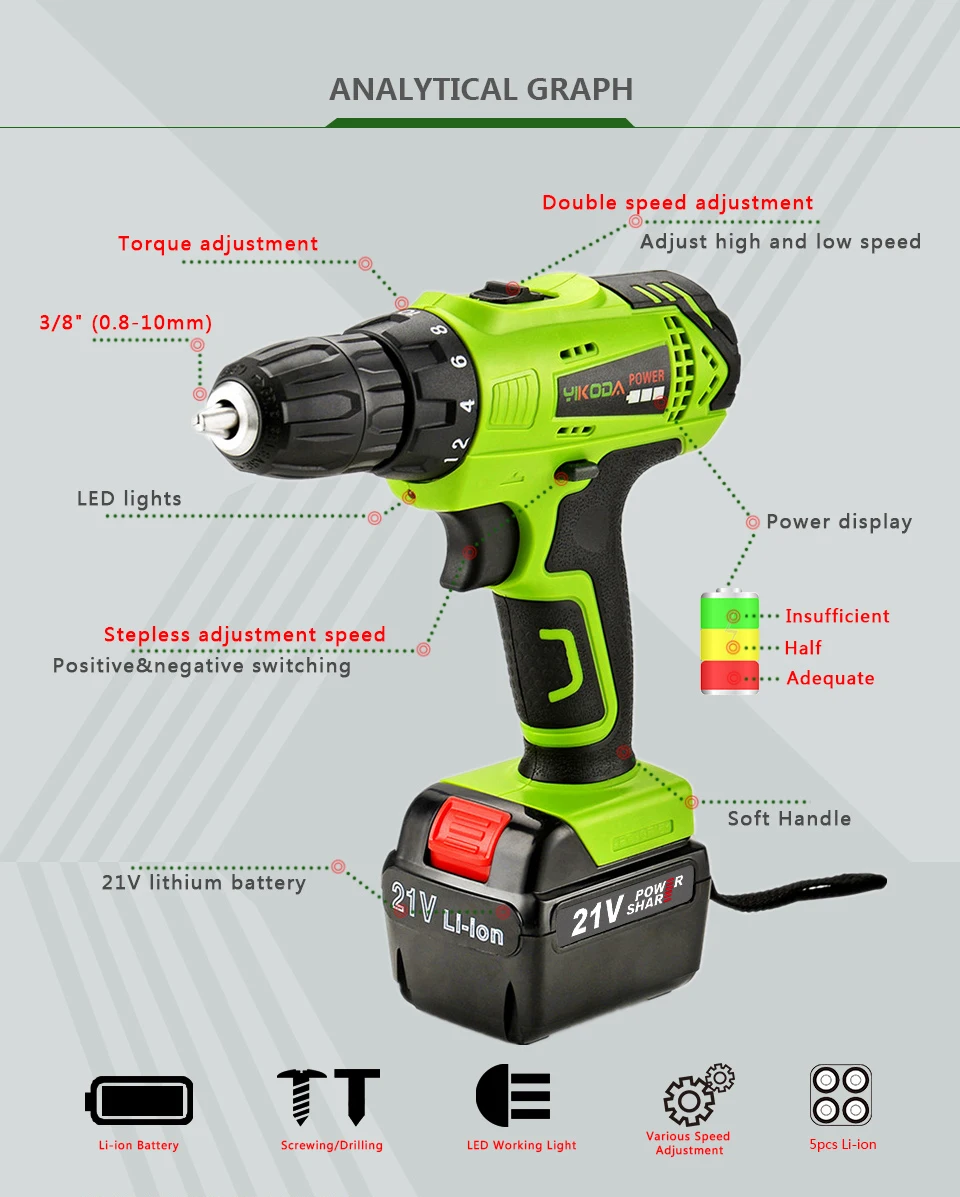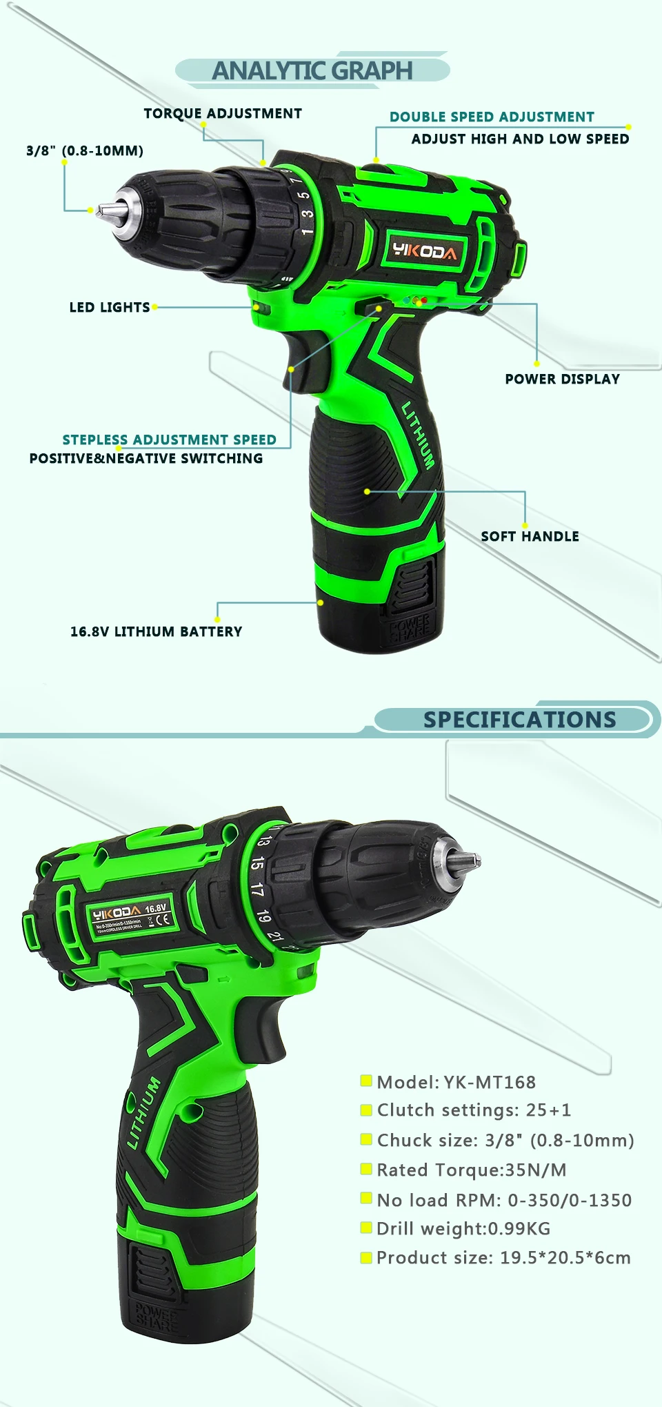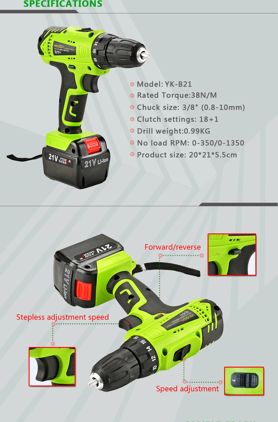 Шуруповерт YIKODA, 16,8 в, 21 в, с литиевым аккумулятором, двухскоростной, 38 дюйма