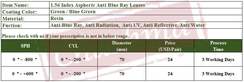 Item nameClear Color Blue Coating Radiation Lens Anti Blue Ray Lenses