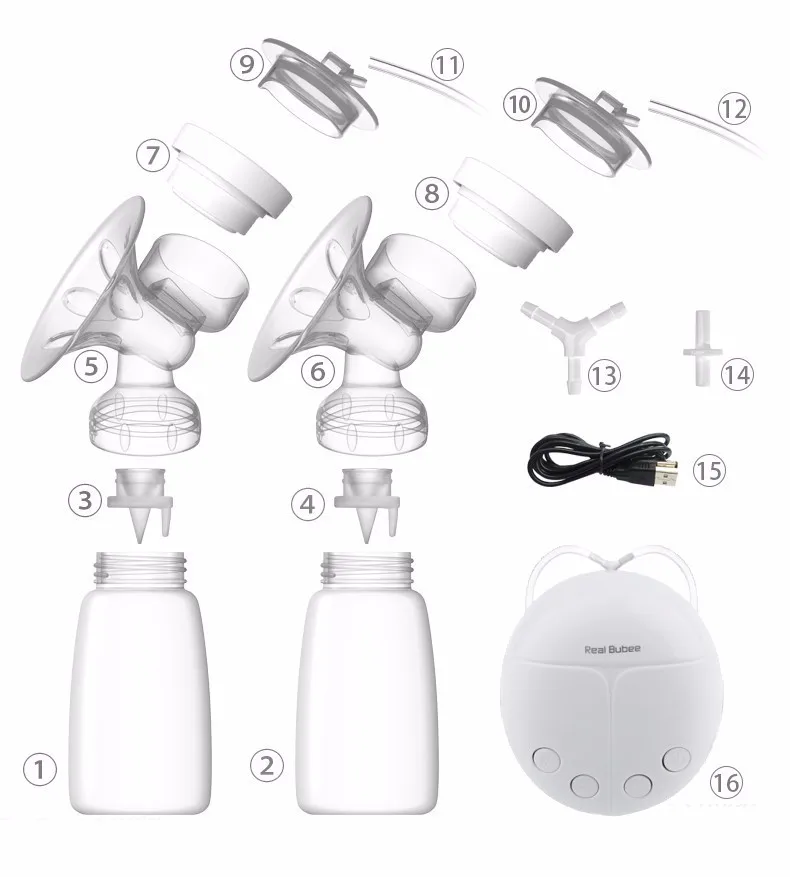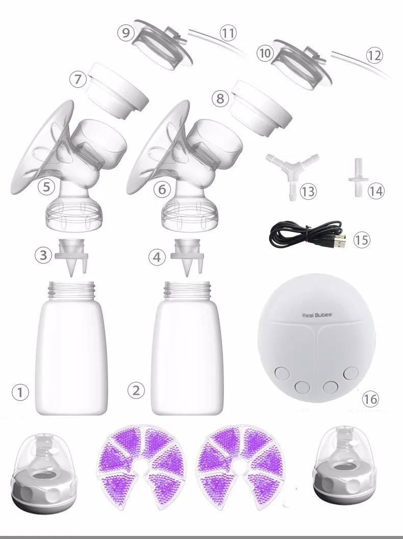 Тип A : 2 молокоотсоса, 2 бутылки для молока, 1 шнур питания USB, 1 хост-компьютер, 2 длинных трубочки, 1 лист наклейки, 2 холодных нагревателя, 2 ниппеля