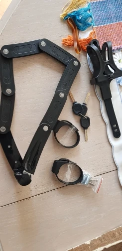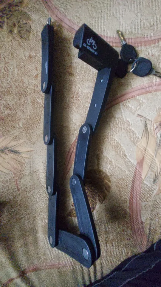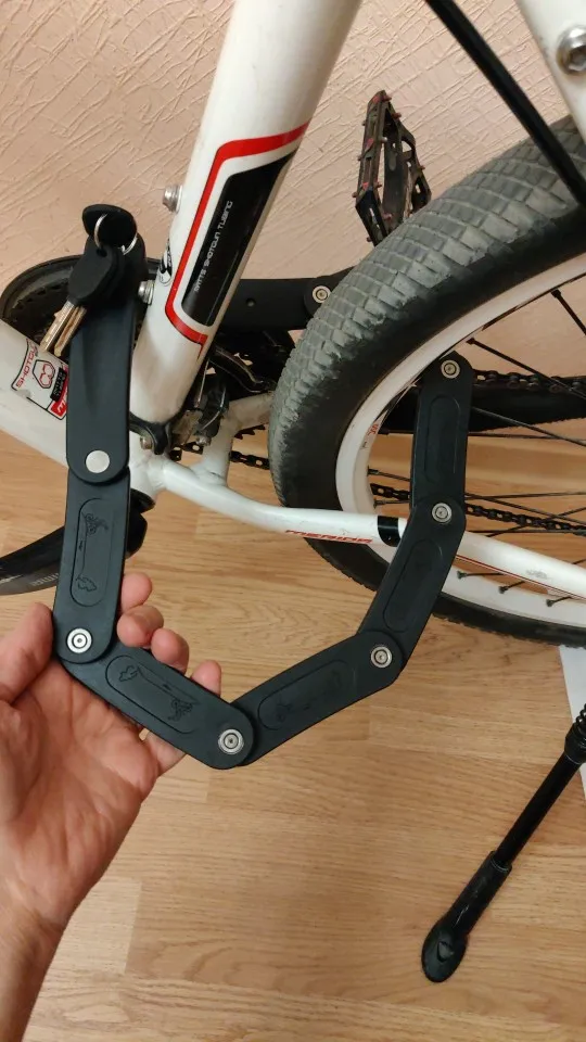 Вещь конечно добротная, но не такая надёжная, как казалось из описания товара. Клепки выглядят немного хлипко по сравнению с пластинами. Дужка замка с одной стороны очень слаба. Но главное, замок из мягкого металла. Шуруповетром высверлить за 10 секунд можно. Я понимаю, что это всё придирки, но за такую цену имею право. Короче максимум пристегнуть, пока вы покупаете воду в магазине, на пару минут. Зато выглядит стильно))