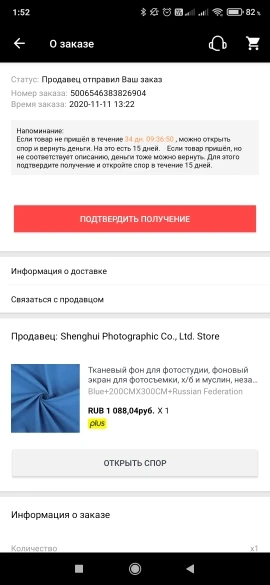 Заказал 11.11, получил 19.11. Курьер позвонил за 10 минут до приезда, хорошо, что был дома. Оперативно, но очень рискованно так ставить людей перед фактом. По товару. Фон очень яркий, довольно лёгкий и тонкий, при этом достаточно плотный, просвечивает, но не критично. С одной стороны полуматовый, с другой блестящий, края обшиты. Размер ткани точно соответствует описанию, с учётом петли под штангу получается на 10 см короче по длинной стороне, всё честно. Немного осыпается, надеюсь, только пока новый. В первый же день был проверен на видео, работает, прогладить и будет полный порядок.