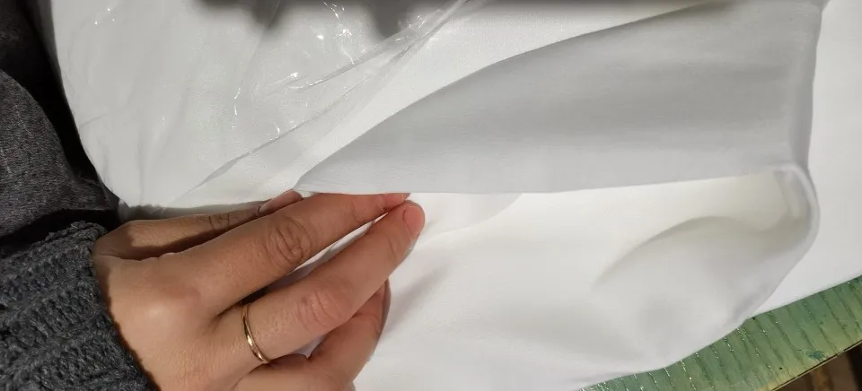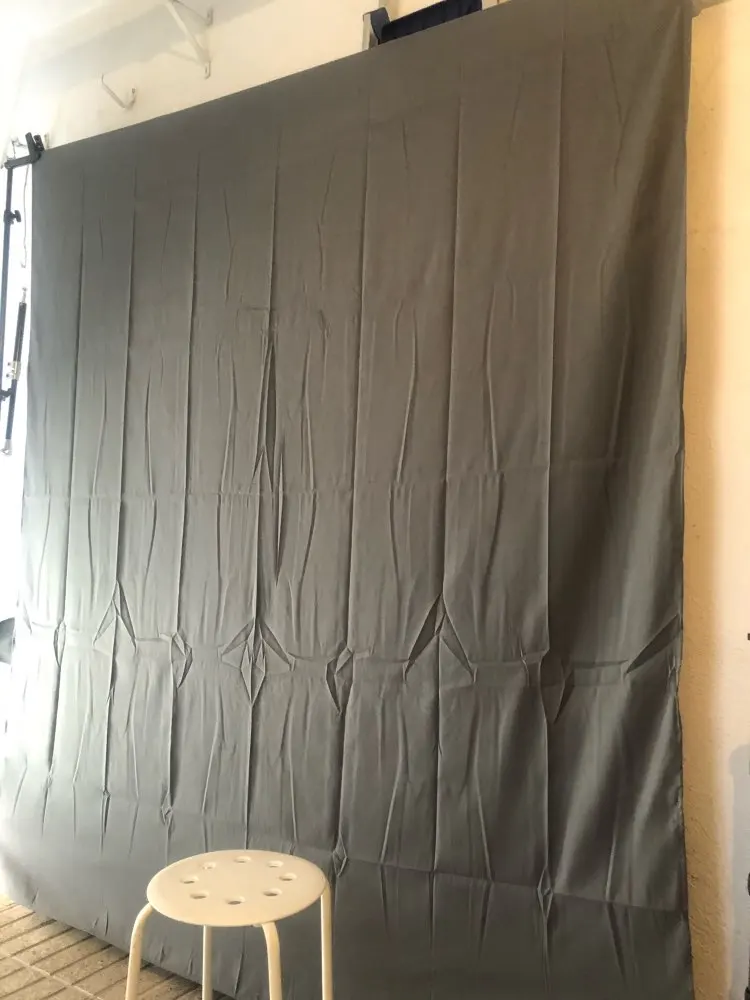 Ткань белоснежная, приятная на ощупь, легко гладится. Мы повесили на стену в 2 слоя. Использую как фон для онлайн-работы. Единственный минус - несколько стянуты швы, из-за этого лёгкие волны на ткани. Но мы булавками прикололи к обоям, натянули, получилось ровно. Если повесить на штангу, будут лёгкие волны.