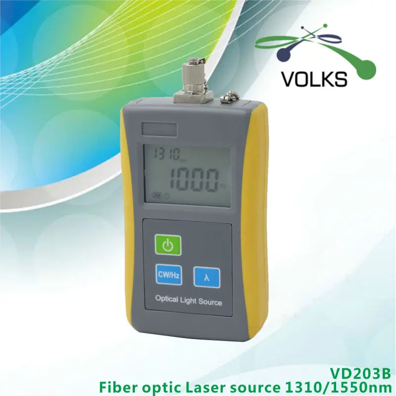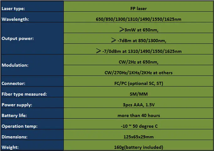 Особенности:1. Хорошая стабильность выходной мощности2. Опционально автоматическое выключение3. Большой ЖК-дисплей и подсветка4. Дисплей питания аккумулятораПрименение1. Техническое обслуживание Телеком2. Техническое обслуживание CATV3. Испытательная лаборатория оптического волокна4. Оптоволоконные датчики
