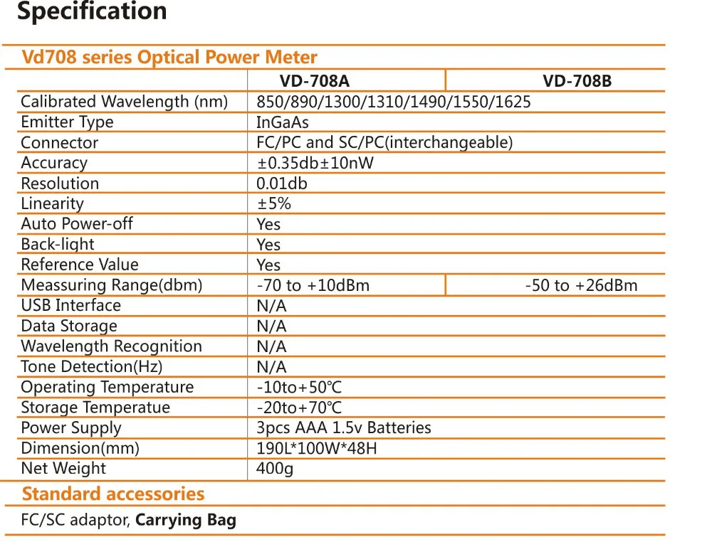 В сборе с 2,5 мм универсальный разъем подходит для всех φ2.5mm оптический разъем. (Поддержка FC/SC/ST разъемы).Низкое энергопотребление, непрерывное рабочее время составляет более 48 часов.Линейная оптическая мощность и логарифмический дисплей питания.Функция измерения относительного значения.Компактный и портативный дизайн
