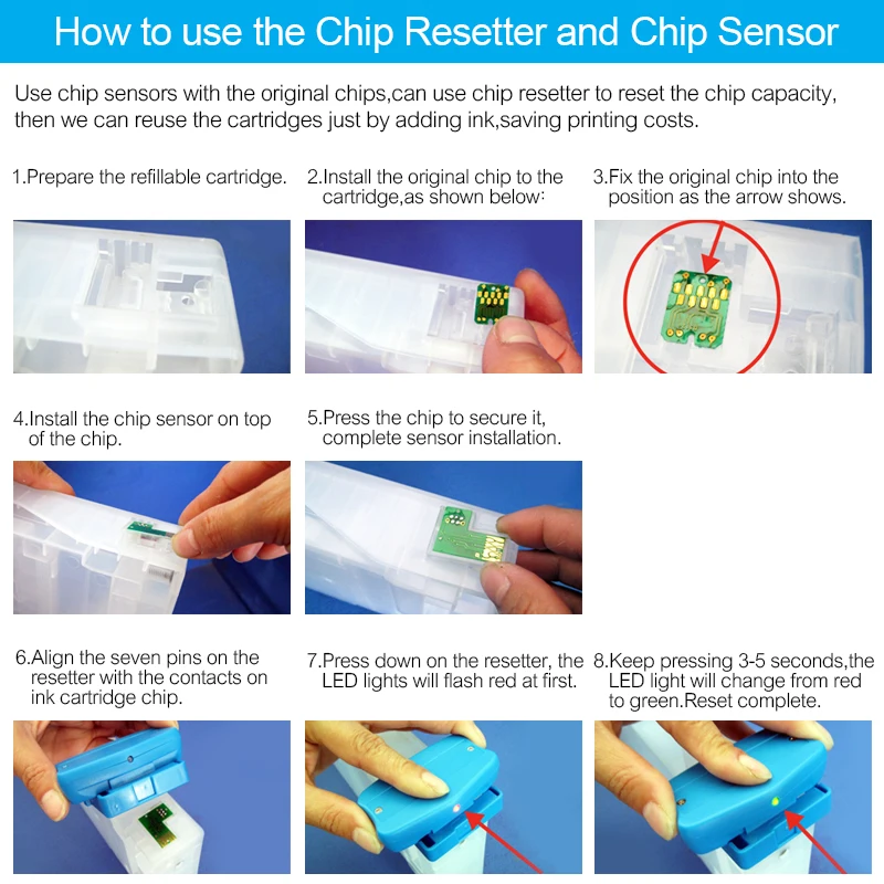 Эти датчики чипа необходимо использовать вместе с оригинальными чипами, вы можете использовать устройство сброса чипа, чтобы полностью сбросить чип картриджа.Способ установки прост, а производительность очень стабильна.