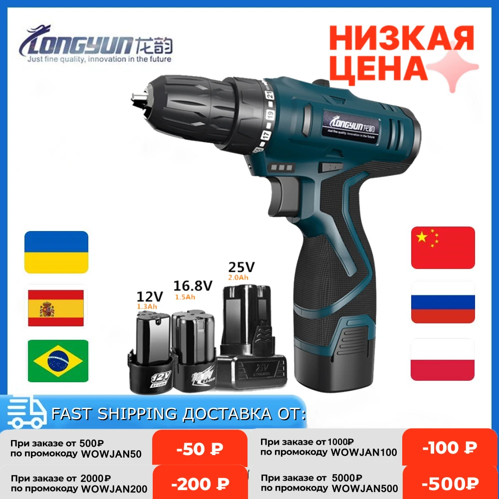 Longyun 12v 16.8v 25v аккумуляторная отвертка с запасным литий-ионным аккумулятором, электрическая дрель, домашняя многофункциональная электрическая отвертка дрель Шуроповерт Беспроводная отвертка Шурик