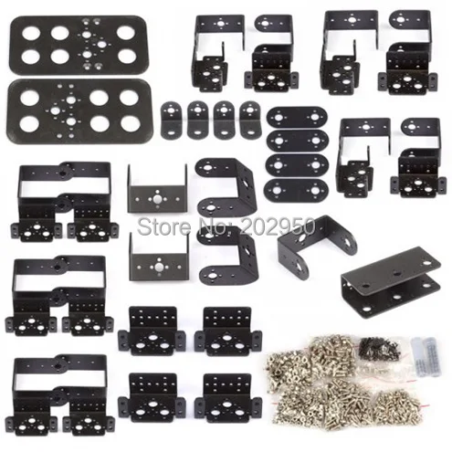 -16 x Многофункциональный кронштейн сервопривода-7 х Коротких u-образных серводвигателей-4 x длинный u-образный сервопривод-4 x косой u-образный сервопривод-4 серводвигателя одного типа-4 x l-образный серводвигатель-1 х u-образный кронштейн для талии робота-Основание для ног-2 шт.-14 миниатюрных шариковых радиальных подшипников-17 x металлический сервопривод (опционально, не входит в комплект)-Комплект винтов и колпачков-1 шт.(Если вам нужен сервопривод, цена будет 71,99 USD)
