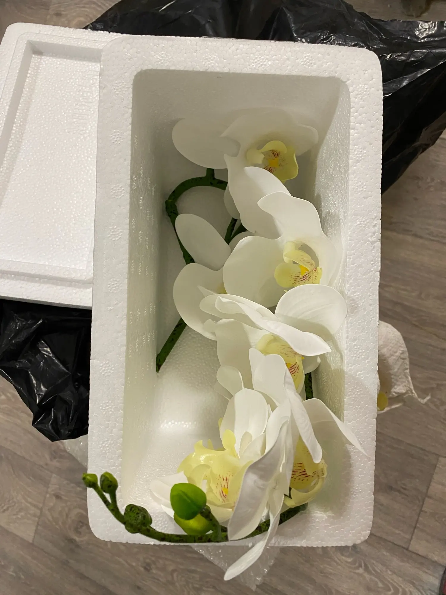 Посылку получила. Ждала не долго. Упаковка была сильно поломана. В некоторых местах на стволе треснула пленка (верхнее покрытие). Но это не заметно. Видно орхидея много перенесла во время дороги)))) В общем выглядит очень красиво. Все как на картинках. Думаю, что закажу ещё))