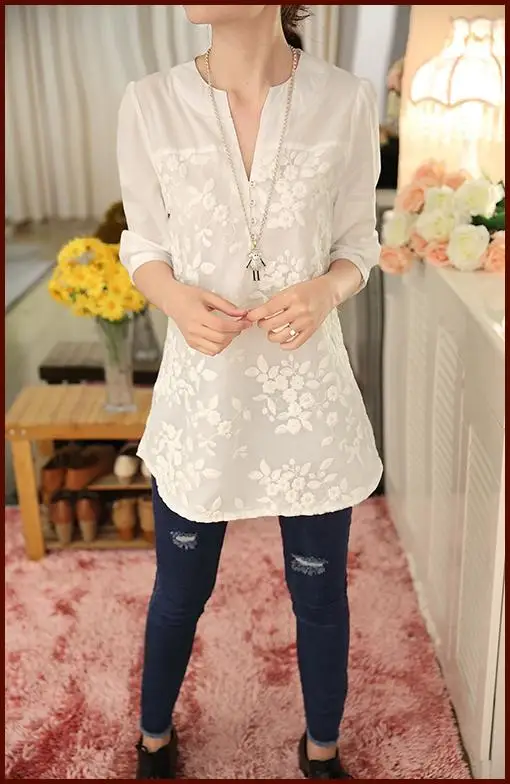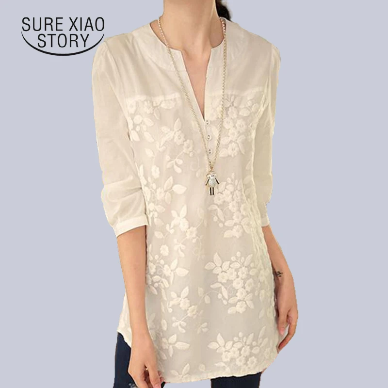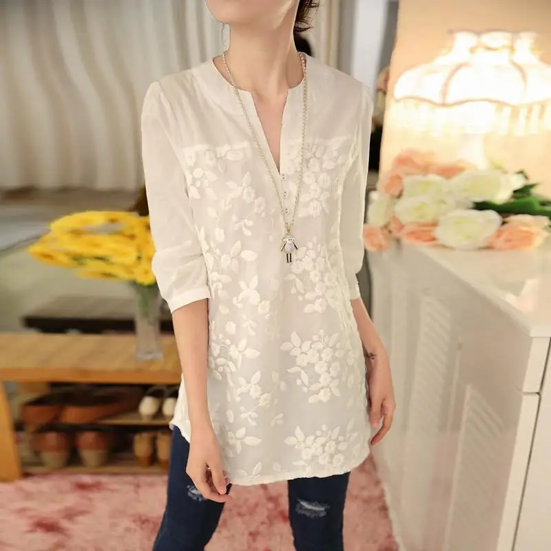 Новая блузка с v-образным вырезом из органзы с вышивкой белая кружевная блузка Топ Плюс Размер Летняя Корейская женская блузка женская цветок блузка 566F 25