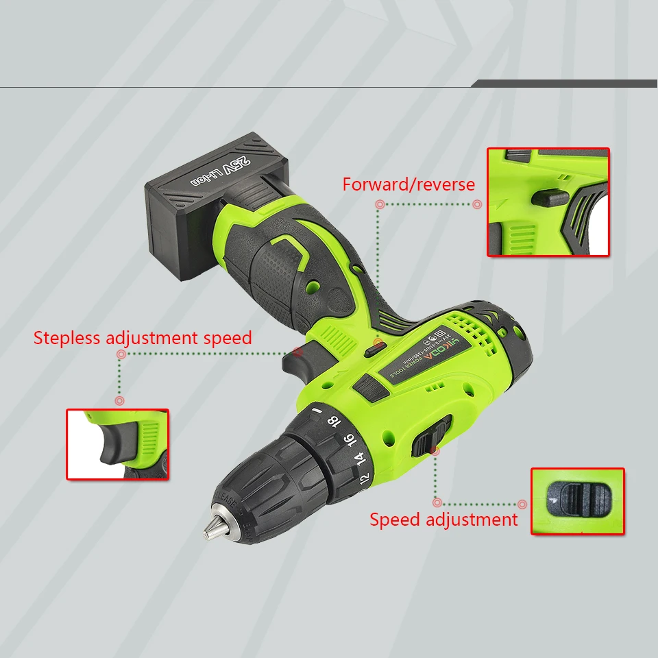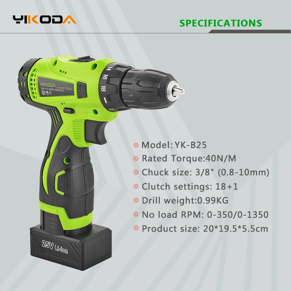 Шуруповерт YIKODA, 25 в, двухскоростной, с литиевым аккумулятором