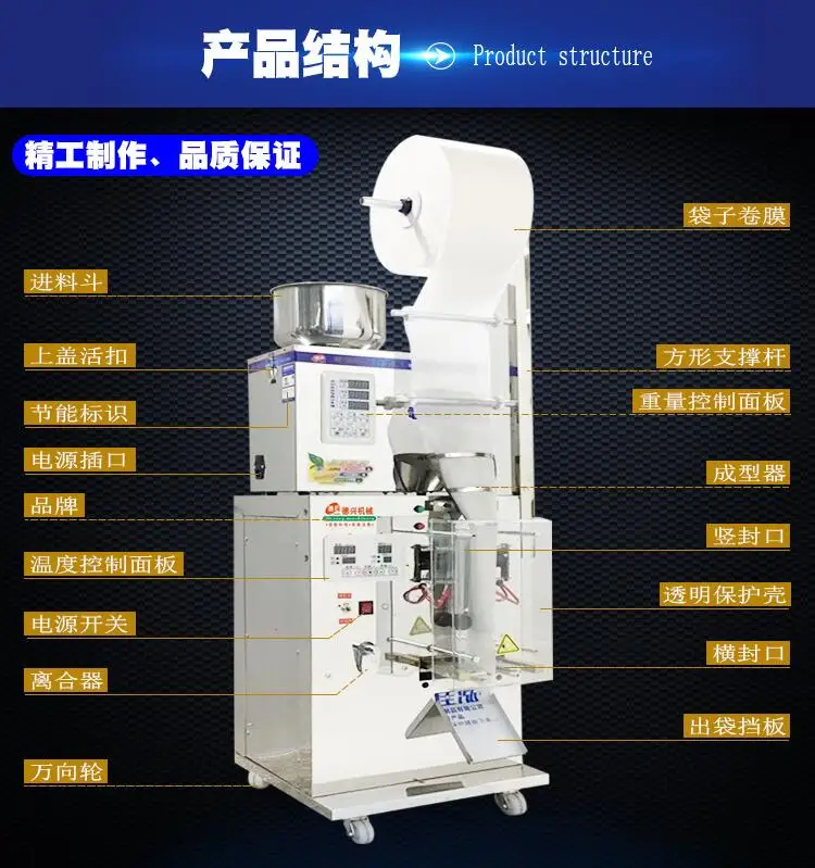 Осторожно: Перед включением удалите транспортировочный винт (маркировка черного всего 3 шт), найденный в нижней части машины, если не удалить, может повредить машину. Мы предлагаем четыре вида упаковочных пакетов на выбор:1, ширина уплотнительной пленки 10 см, ширина упаковочных изделий 5 см, длина 1-16 см регулируется2, ширина уплотнительной пленки 12 см, ширина упаковочных изделий 6 см, длина 1-16 см регулируется3, ширина уплотнительной пленки 14 см, ширина упаковочных изделий 7 см, длина 1-16 см регулируется4, ширина уплотнительной пленки 16 см, ширина упаковочных изделий 8 см, длина 1-16 см регулируется5, ширина уплотнительной пленки 18 см, ширина упаковочных изделий 9 см, длина 1-16 см регулируется6, ширина уплотнительной пленки 20 см, ширина упаковочных изделий 10 см, длина 1-16 см регулируетсяРазмер сумки может быть фиксирован только шириной паутины, длину можно регулировать, в момент покупки вашей машины пожалуйста выберите вышеуказанные четыре размера одного размера ширины, пожалуйста оставьте сообщение при заказе. Если нет сообщения, мы отправляем по умолчанию ширину 16 см, ширину 7 см. Характеристики упаковки. СпасибоИзвините, потому что продукт из верхней части фасовочной машины и следующих компонентов автоматической запечатывающей машины, поэтому мы должны разделить две поспосылка ЛКИ, отправленные вам. Обратите внимание на время покупки.URL-адрес видеоинструкции по эксплуатации: https://youtu.be/QM0eX53GysEОсновные технические параметры:Скорость Aliquot: 15-25 раз/мин 600 мешков/час (в зависимости от материалов и разного веса aliquots)Область применения: общий твердый материалРазмеры: 43 × 51 × 143 смПитание: 220 В-50 Гц/110 В-60 ГцМощность: 360 ВтВес товара от Aliquot: 2 до 50 г (возможен выбор различных характеристик)Точность Aliquot: 0,2 г (в зависимости от материала)Подходящие материалы: можно использовать термоусадочную пленкуВес: 60 кгМашина может фильтровать упаковку из папиросной бумаги, прозрачные пакеты из композитной пленки, пакеты из алюминиевой фольги, тканые и другие герметичные полиэтиленовые пакеты.1. Использование машинки, фильтровальной бумаги, композитной пленки, алюминия универсальное;2. Разъемная конструкция, сочетающая в себе более гибкую и простую в использовании, уход;3. Автоматическая упаковка, экономит много рабочей силы и ресурсов;4. Можно использовать посылка: чайный порошок, китайский медицинский порошок, Оздоровительный чай, семена, кунжут, китайская Волчья ягода, электронные компоненты,Цельнозерновые, зерновые продукты и многое другое!Особенности:Особенности машины; Упаковочная машина с запечатываемым задним уплотнением, независимое верхнее и нижнее Температурное уплотнение, более стабильное нагревание, более безопасное уплотнение, самая большая особенность этой машины-полностью автоматическая упаковка с обратной запечаткой, упаковочные пакеты из готового продукта очень красивые, упаковка из продукта при красивом внешнем виде, Чем вы, родители, которые вели бизнес в течение трех лет, чтобы продавать, ой, упаковка продукта, Привлекательный бизнес, естественно, еще лучше продажи, с красивыми упаковочными продуктами, как пакеты для упаковки пищевых продуктов. Скорость упаковки 10-25 мешков около одной минуты может зависеть от разных предметов, автоматического измерения веса, автоматической резки, автоматического запечатывания мешков, автома