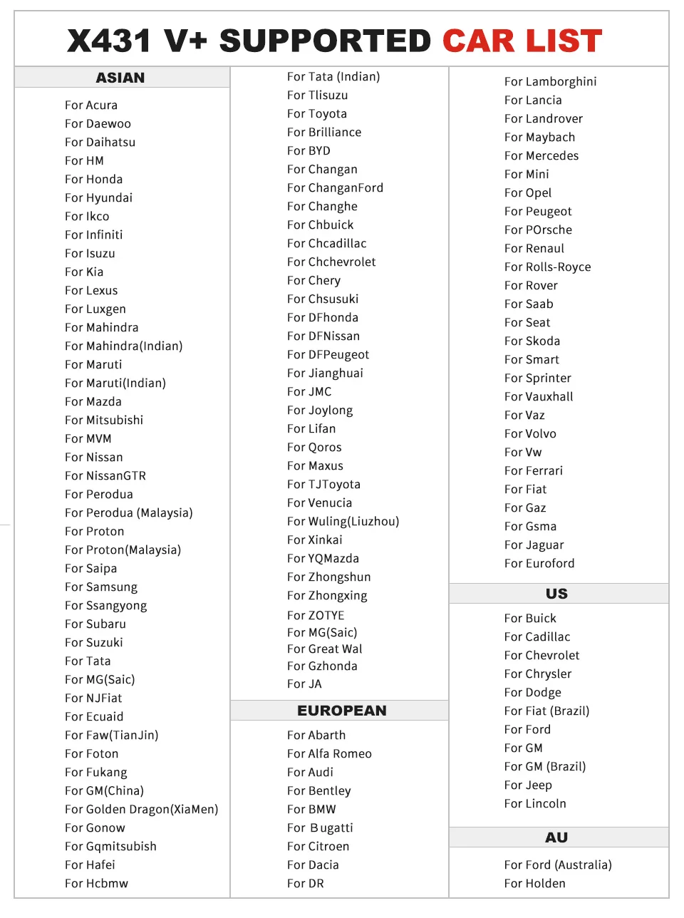 BMW, Benz, GM, USA Ford, Chrysler, VW, Porsch, Toyota, Volvo, Audi, Acura, Changan, Daweoo, Gas, Hafei, Huachen, Jiao, Lexus, Xiali, xinkai, Fiat, Holden, Maruti, Opel, Peugeot, Saab, Ssangyong, Tata, Changhe, Флаер, GMSA, Infiniti, Mahindra, Perodua, Proton, Qirui, Tlisuzu, Zhongshun, EOBD2, Euroford, Jagar, Renault, Smart, Sprinter, ВАЗ, Changcheng, Dacia, Ford, HaoQing, jinlong, Liuwei, Rover, ZhongTai, ZhongXing, Bxfiat, HM, Isuzu, Jacty, JPIsuzu, Mazda, Seat, Skoda, Suzuki, Daihatsu, Mitsubishi, Citroen, Hyundai, Kia, Lancia, Landrover, Nissan, Romeo, SubaruПримечание: дополнительный модуль грузовика LAUNCH X431 HD, вы можете приобрести X431 HD отдельно и бесплатно обновить диагностическое программное обеспечение грузовиков для диагностических грузовиков. (Если вы заказываете x431 HD и работаете с X431 V +, ваш LAUNCH X431 V + будет расширен до бензиновых автомобилей и дизельных грузовиков диагностическое устройство 2 в 1.)