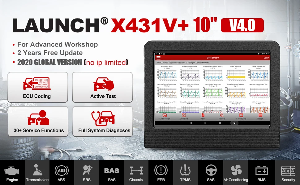 LAUNCH X431 V + может считывать коды неисправности и потоки данных для всех систем для комплексной диагностики автомобиля, включая топливную систему, систему выбросов, трансмиссию, двигатель, кузов, силовой агрегат и многое другое, таким образом, пользователям не придется покупать другие инструменты для диагностики систем для экономии времени и денег.