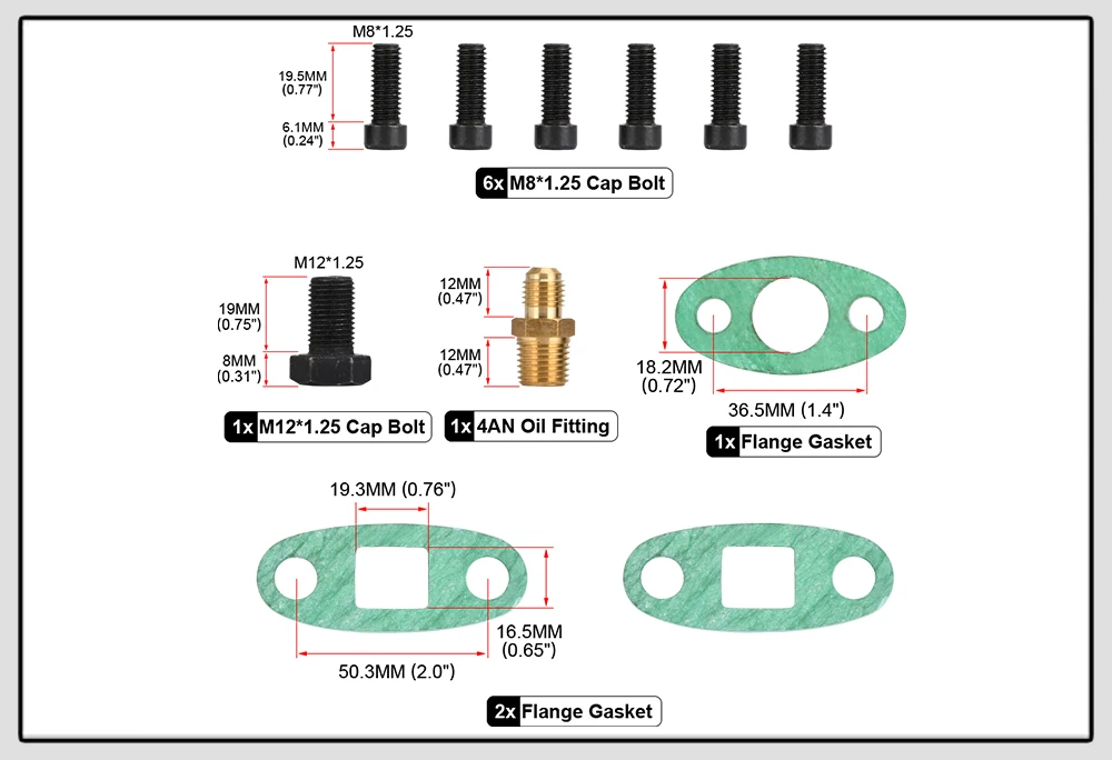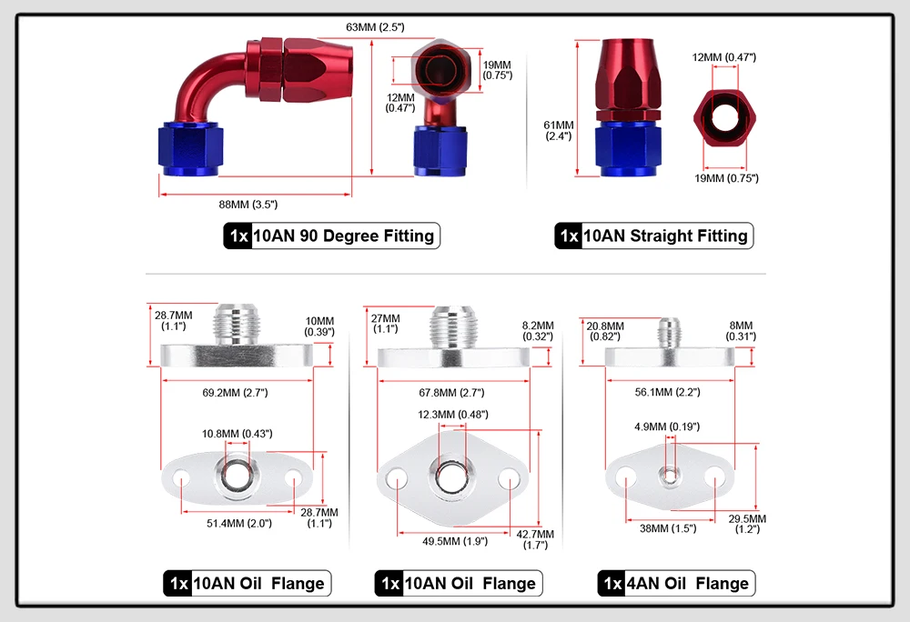 1X AN10 алюминиевый обратный фланец для слива масла, который крепится к блоку1X AN10 алюминиевый возвратный фланец для слива масла, который болтов в Турбо (2-hole-осевая линия расстояние = 51 мм или 2 ") работает для многих турбокомпрессоров.1x AN4 Алюминий подачи масла фланец (с маслом ограничитель встроенный) о том, что болты с Turbo (2-Hole-Centerline расстояние = 38 мм или 1,5 ") работает на протяжении многих турбины.1X AN4 алюминиевый фланец подачи масла, который крепится к блоку (один из 2 заводских двойных турбо масляных кормов, поставляет масло в Турбо)1 болт крышки, который болт к блоку (уплотняет один из 2 заводских двойных турбо масляных лент)1x AN10 плетеная обратная линия слива масла.1x AN4 плетеная линия подачи масла. Женский AN4 на обоих концах. С 90 градусов соединителем локтя.1 x AN10 45 градусов.1 x AN10 90 градусов. (100% абсолютно новый никогда не использовался или не установлен)