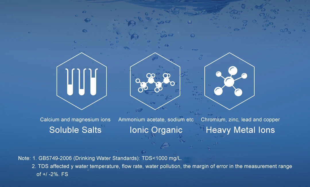 Значение TDS представляет содержание растворимых твердых веществ в воде и может в определенной степени отражать качество воды. Как правило, чем ниже значение TDS, тем менее растворимые соли, такие как ионы тяжелых металлов в воде и более чистое качество воды. Всемирная организация здравоохранения (ВОЗ) обычно считает, что сопло с TDS значением ниже 600 чувствует себя хорошо или уместным. Когда уровень TDS превышает 1000, вкус питьевой воды значительно меняется.