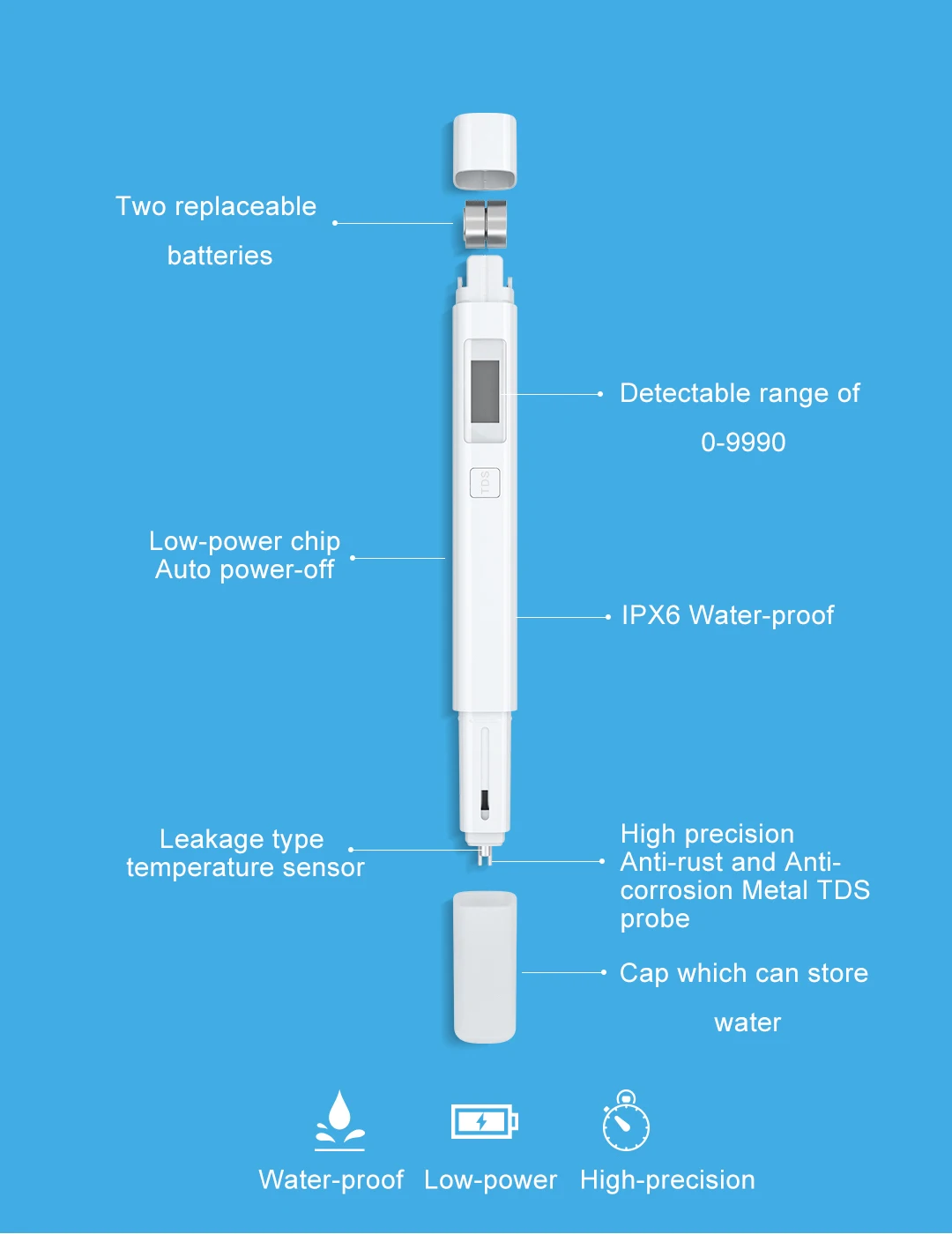 Различные дома будут иметь различное качество воды в различных областях, Ручка обнаружения качества воды MI TDS может точно определить значение воды TDS, он может обнаруживать качество воды до и после фильтра воды, отражая возможности фильтрации воды фильтра воды.В общем, более низкое значение TDS будет указывать на меньшее выветривание твердых веществ в воде, более чистое качество воды.