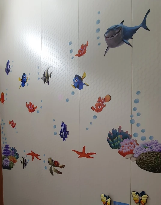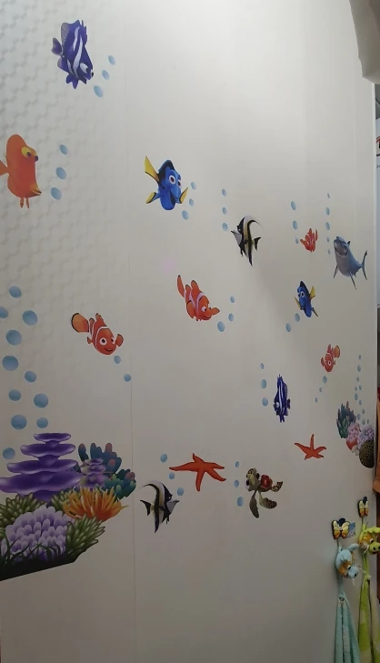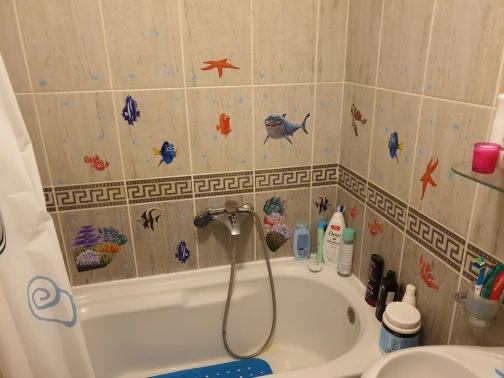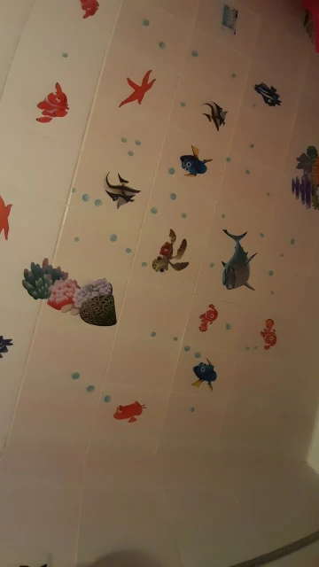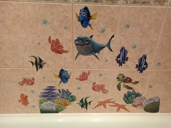 помыли ванночку детскую. наклеили. все кроме четыре рыбки. у них не очень было качество изображение. а остальные классные. до этого три с половиной года другие были. тоже с Али. надеюсь и эти долго продержатся