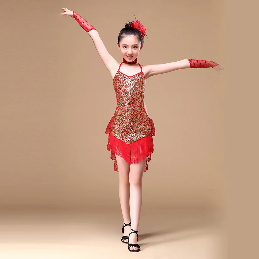 От 5 до 15 лет Детская одежда для танцев с рукавами и блестками, латинские платья для девочек с открытой спинкой и бахромой, бальное платье для латинских танцев для девочек