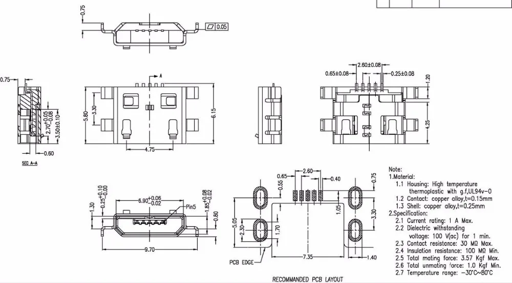 100 шт., Micro USB 5pin, 0,8 мм, без бокового разъема типа B, плоский разъем без скручивания, боковой гнездовой разъем для мобильный телефон, мини-USB