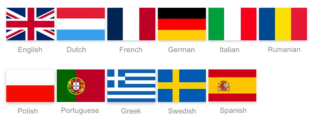 Поддержка языков: английский, французский, испанский, немецкий, шведский, голландский, польский, итальянский, румынский (Примечание: Основной язык: английский, французский и испанский.