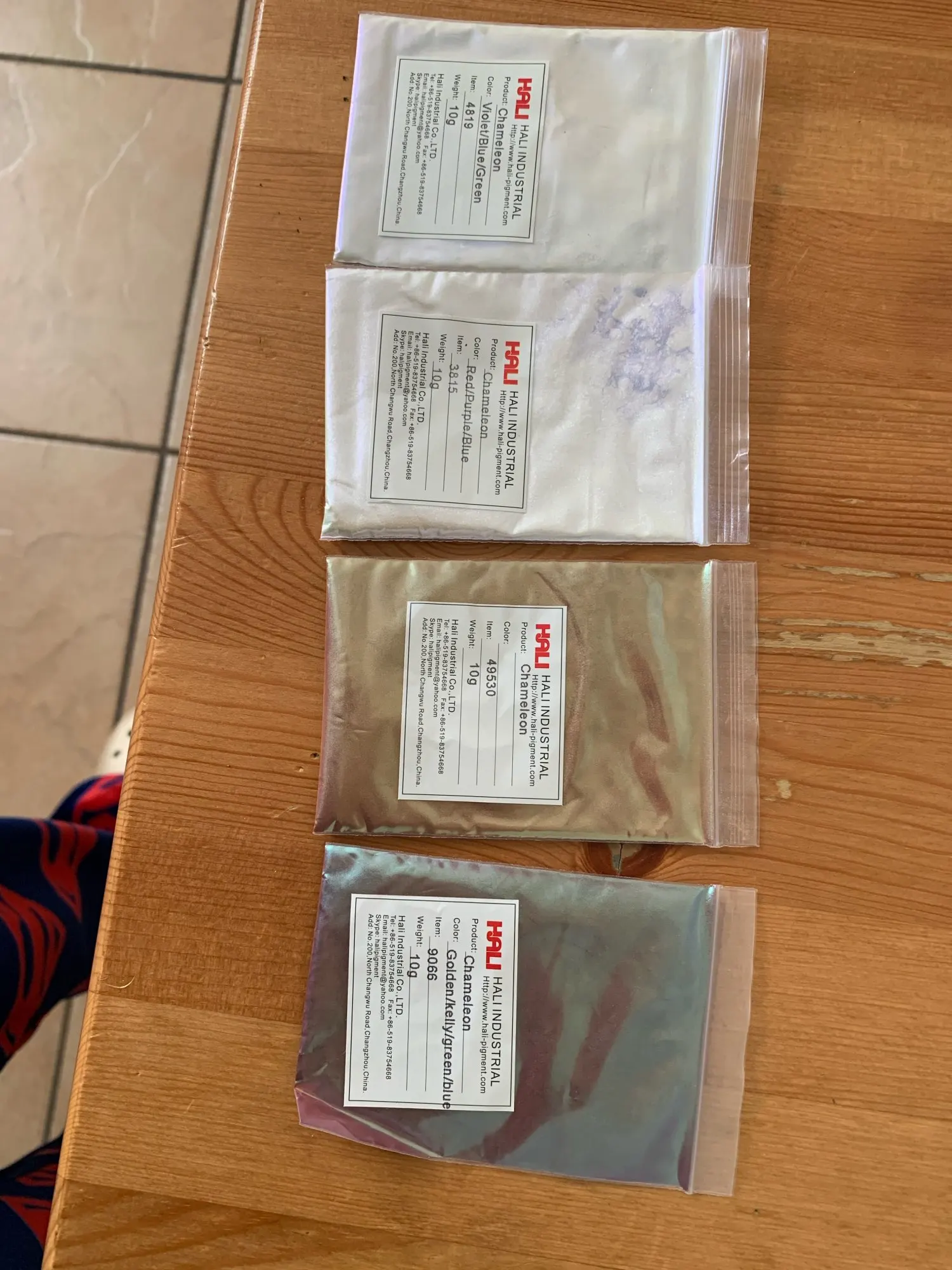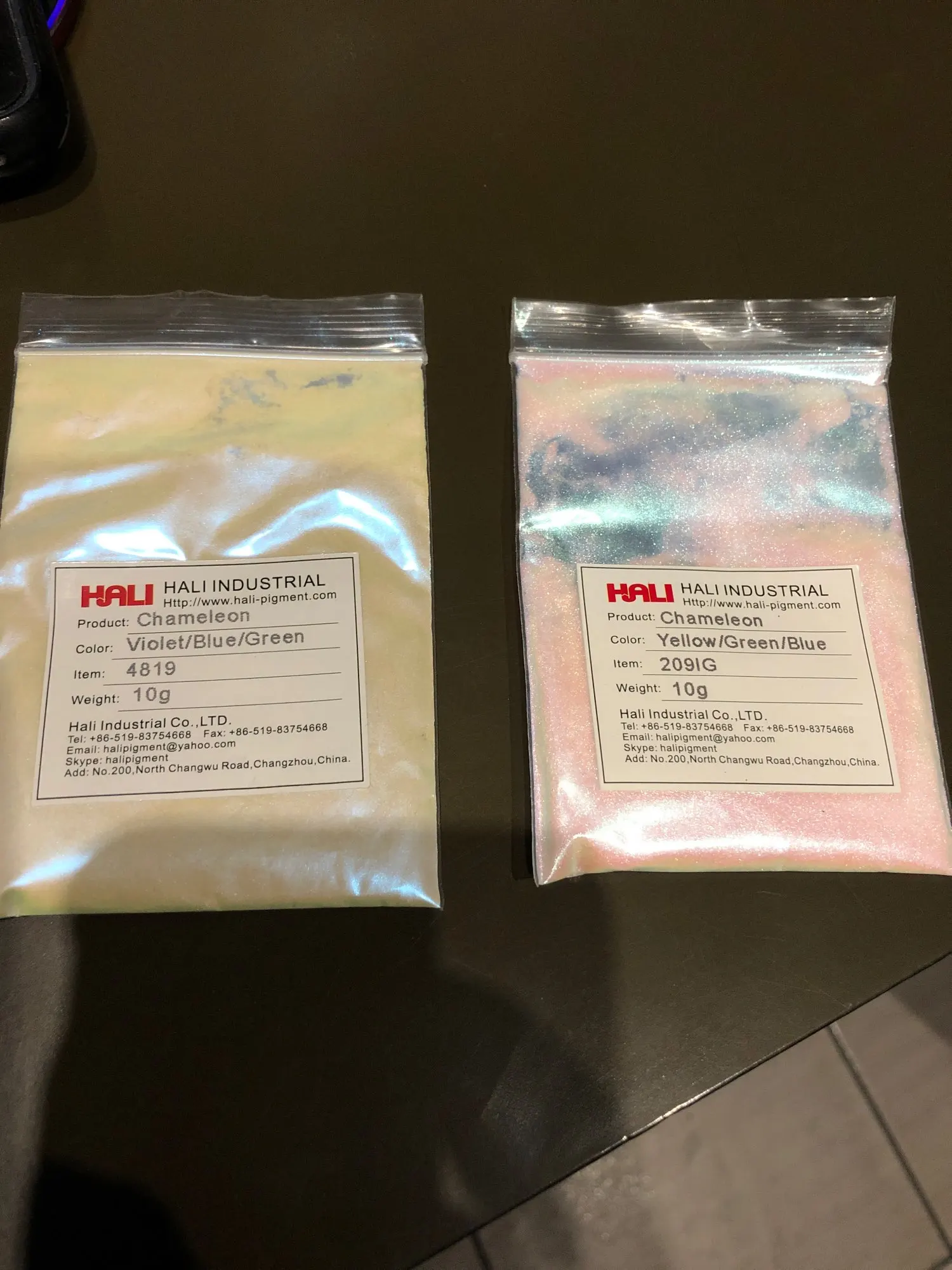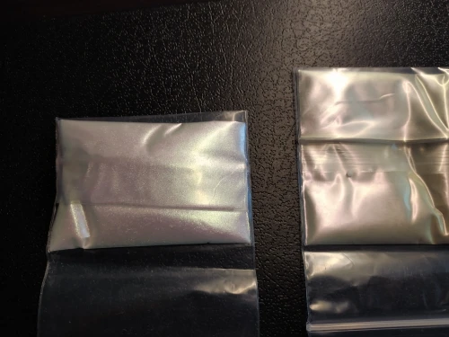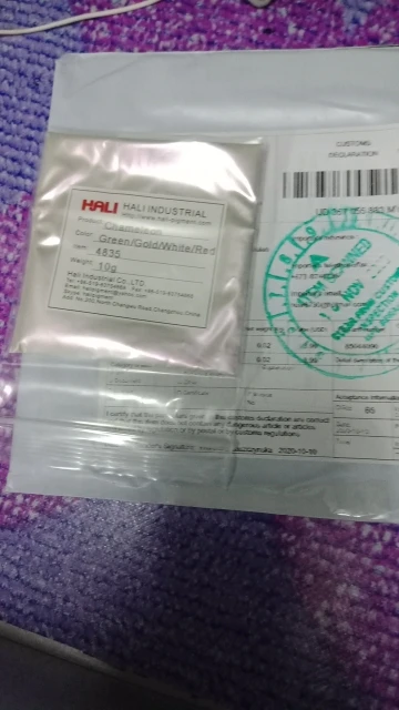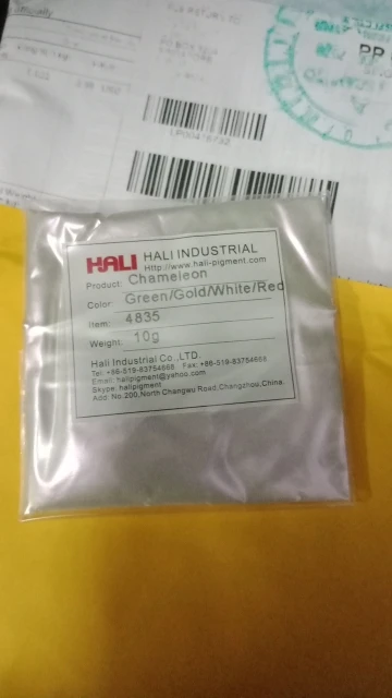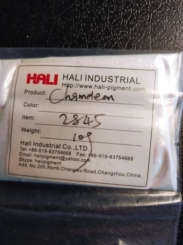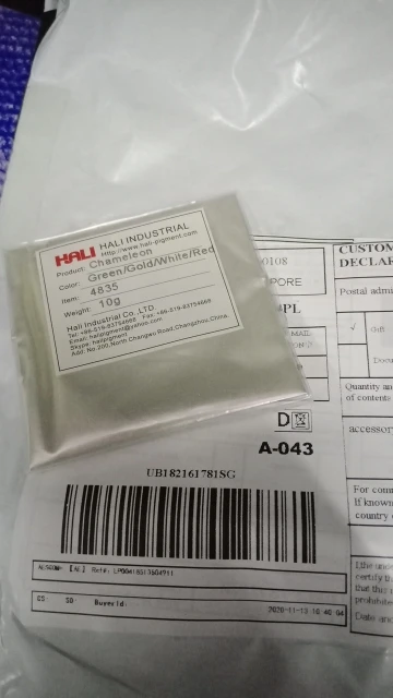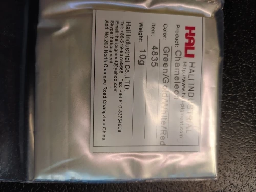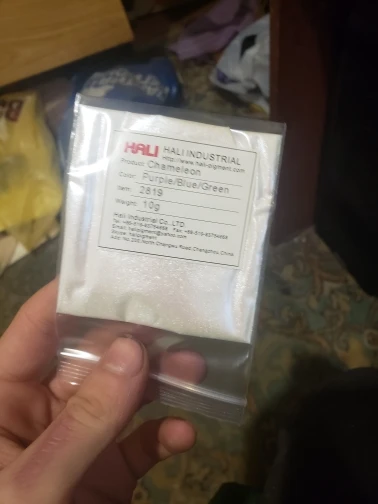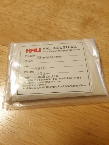 Пигмент замечательный. До Москвы приехал за месяц. Порошок мелкий, брала для смолы. Переливается великолепно. Лучше всего видно на черном цвете. Сам порошок белый. Все соответствует описанию. Рекомендую к покупке.