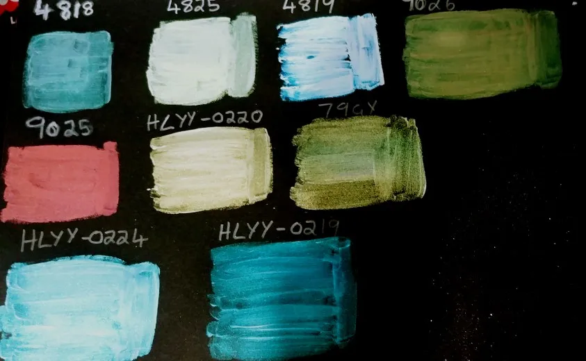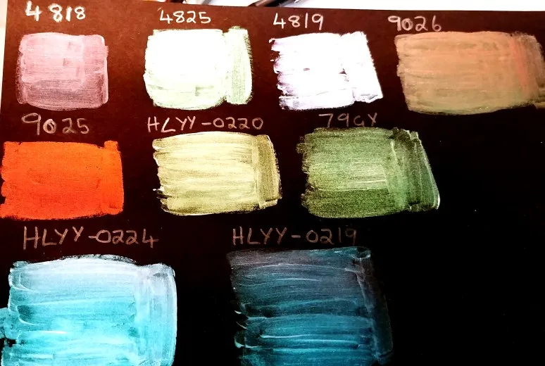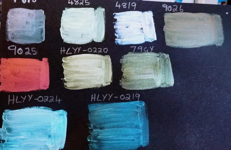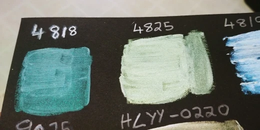 Хамелеоновые пигменты потребовали много времени, чтобы приехать, потому что они потратили один месяц на таможне США. Цвета точные. Я купил девять цветов и смешал каждый из них с матовым акриловым гелем среднего и окрашенным на черном кардштоке и белом кардштоке. Цвета слева направо: 4818, 4825, 4819, 9026, 9025, HLYY-0220, 79GY, HLYY-0224, HLYY-0219. Я сделал фотографии под разными углами, чтобы вы могли видеть цвета. 4818. Светло-зеленый на белой бумаге и красивое сочетание бирюзы и зеленого на черной бумаге.