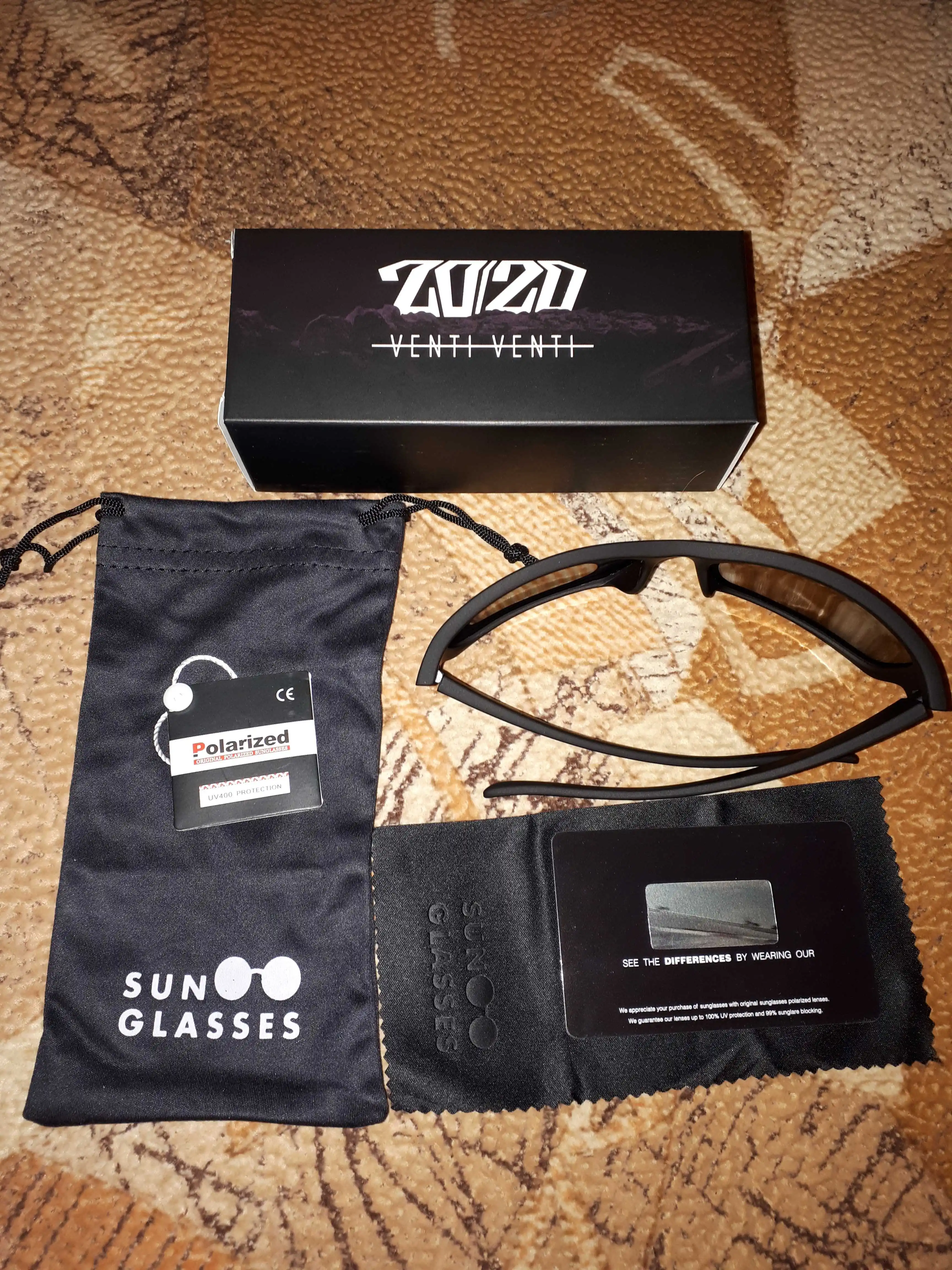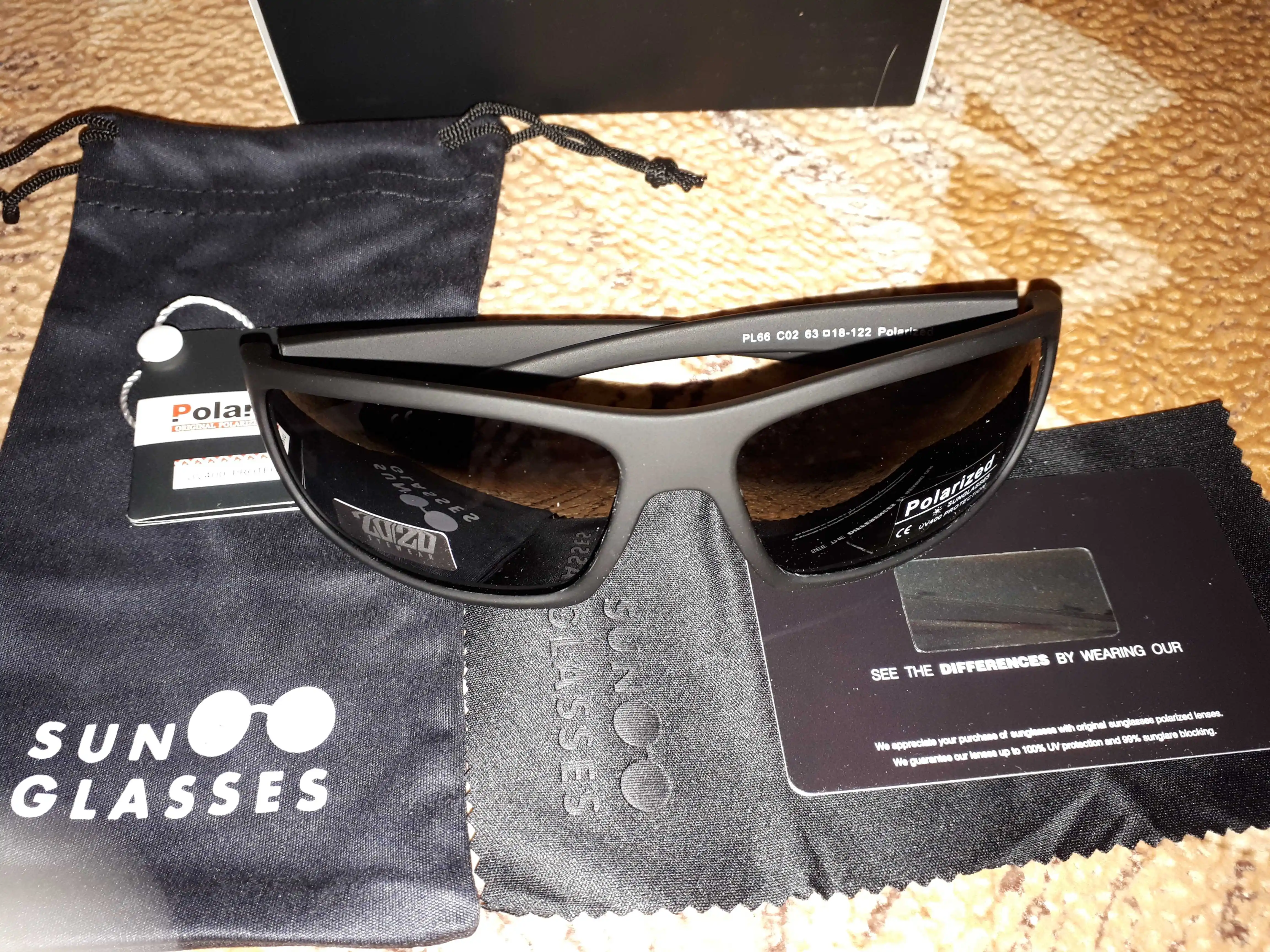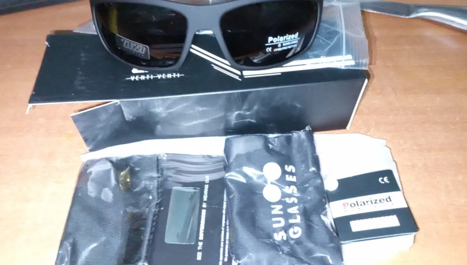Всё отлично!!! На фото видно содержимое посылки. Есть карта для проверки поляризации очков!!!!! Прикольно!!!! В комплект, так же, входит мешочек для очков и салфетка для оптики. Продавец красавчик. Отправил на следующее утро! Рекомендую!!!