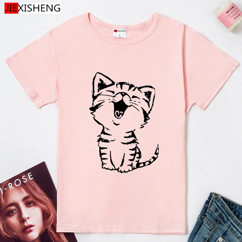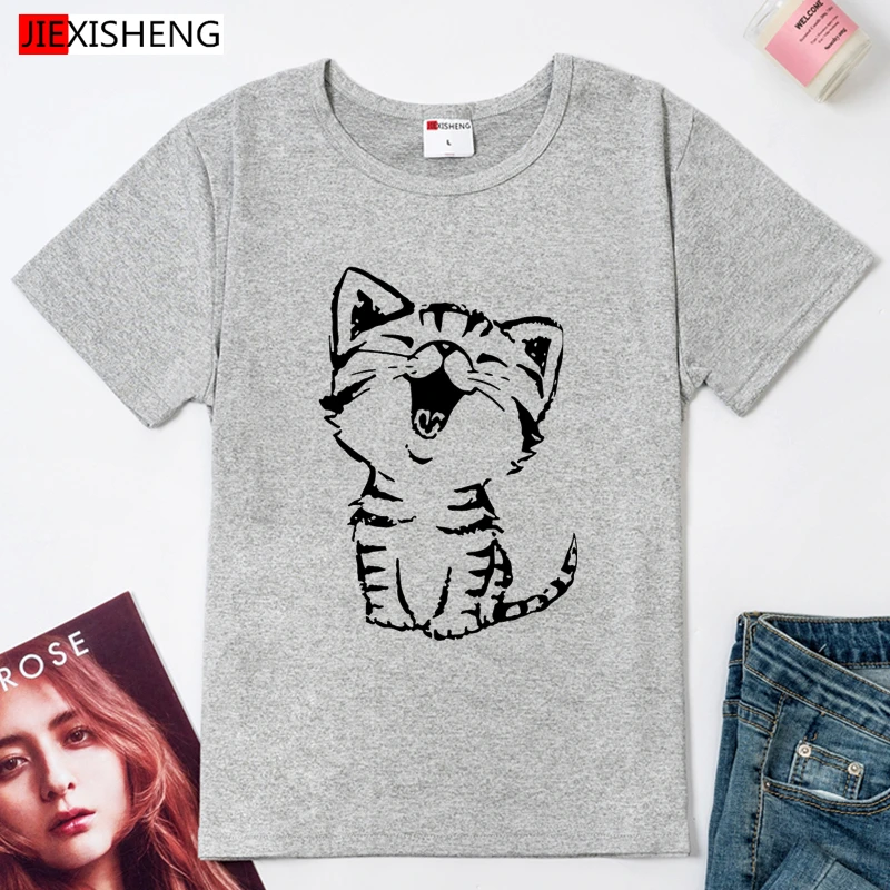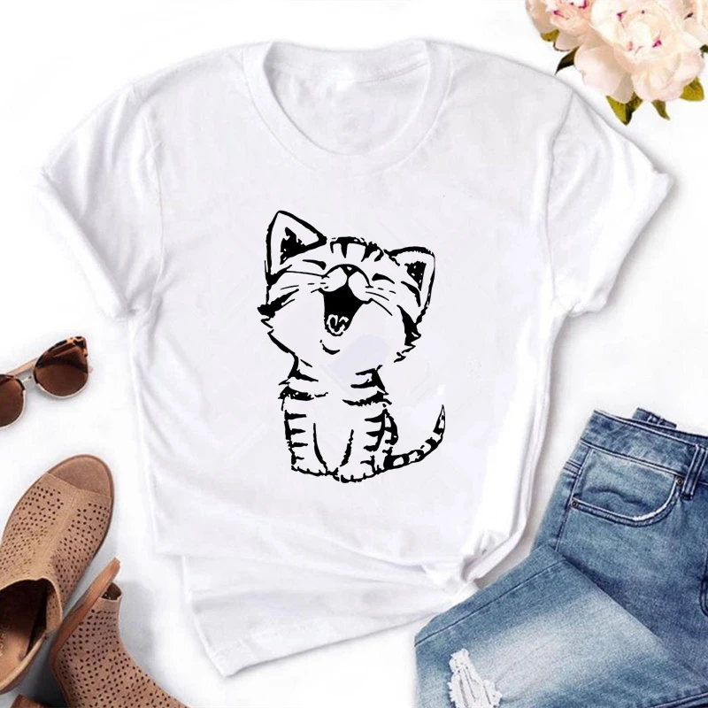Летняя новая модная женская Повседневная футболка с круглым вырезом, топы Camisas с забавным принтом кота и коротким рукавом HH08