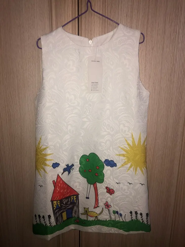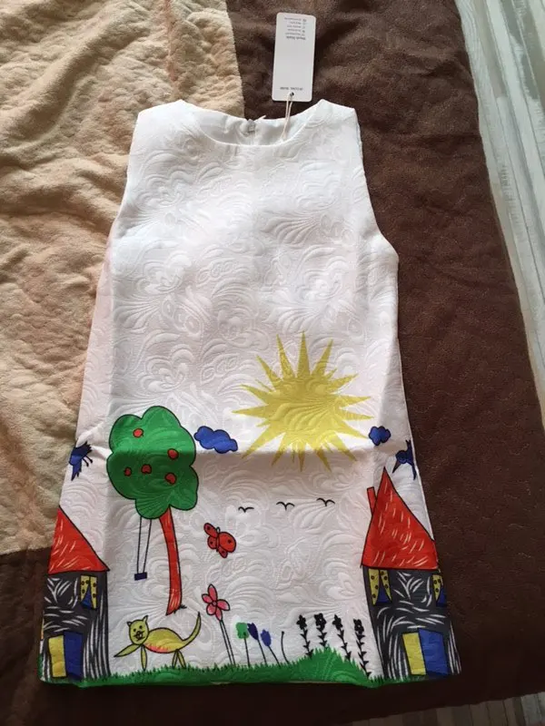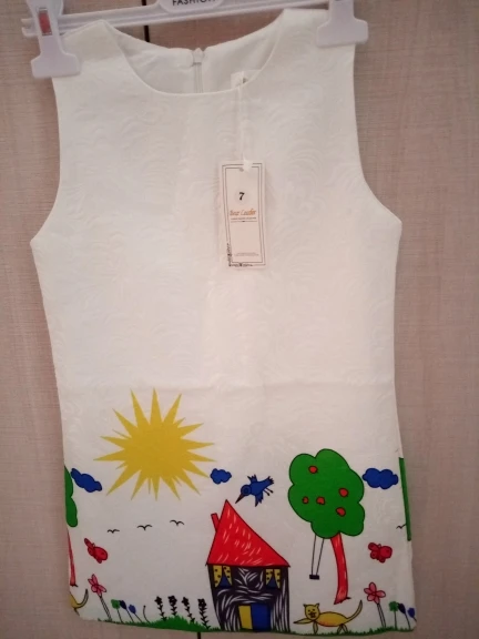 Товар отличного качества, Доставка очень быстрая. Яркий красочный принт, который не выцветает и не теряет цвет при машинной стирке, у платья имеется подкладка, мягка молния на спине не царапает спинку ребёнка, на возраст 5 лет (120см) заказывали 7Т и не прогадали.
