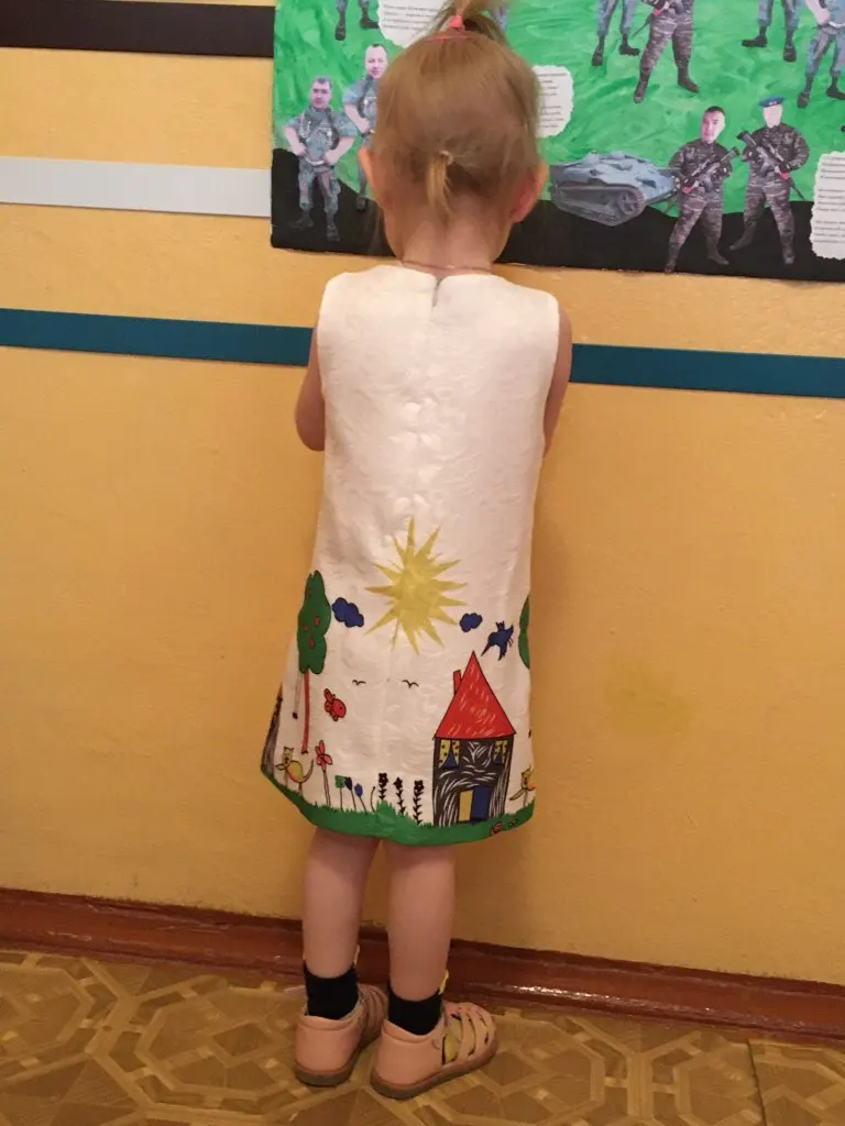 Платье с детским рисунком очень красивое. Двуслойное. На ребенка ростом 118 см по колено. На полную девочку не пойдет. Для худеньких.
