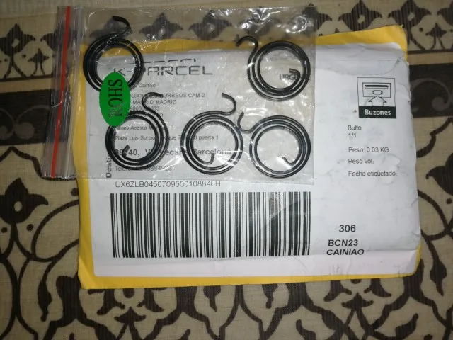 Отправка пружин уже на следующий день, 26 дней до СПб. Пружина, с виду, такая же как и в моей дверной ручке morelli, но на деле оказалась чуть шире. При сжатии, в отличии от оригинала, ручка идёт рывками. Из-за отличий в размере, при фиксации пружины стопорным кольцом, её прижимает слишком сильно и ручка еле поворачивается. Буду пробовать подточить пружину..