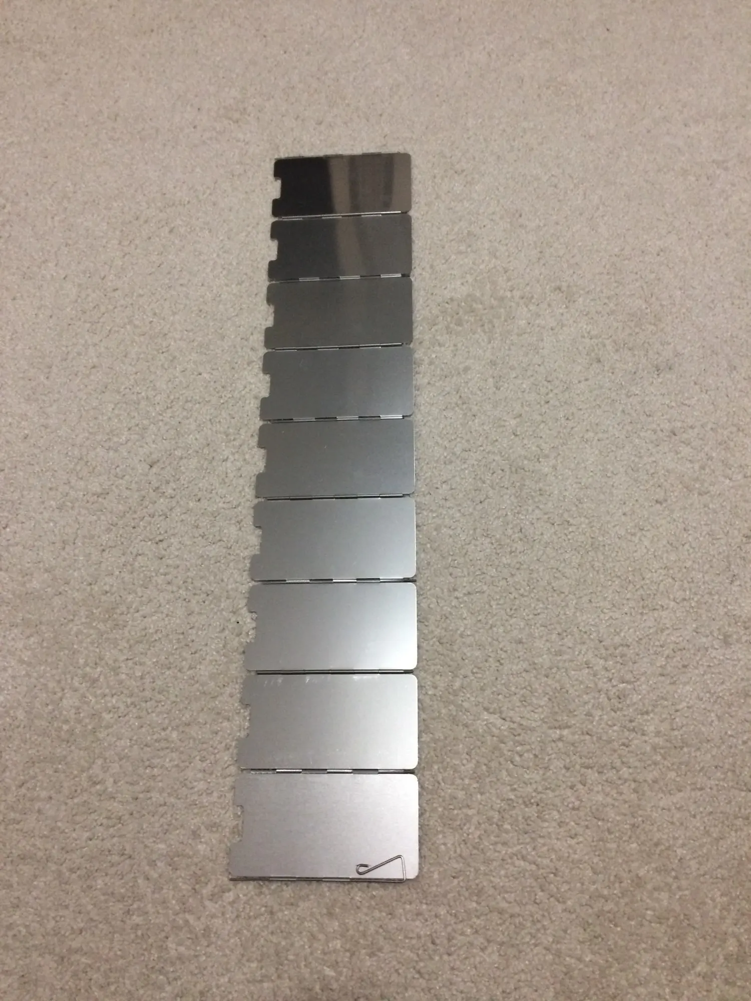 Выглядит очень хорошо, легкий и компактно упакован в коробку. На последних пластинах есть два шипа, поэтому они могут быть прочно закреплены в земле. Простое и полезное снаряжение для кемпинга. Хотя и не очень высокий. Медленная доставка.