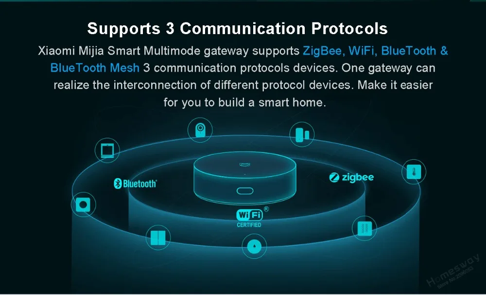 Xiaomi Mijia Smart Multimode gateway поддерживает ZigBee, WiFi, BlueTooth и BlueTooth Mesh 3 коммуникационные протоколы устройств. Один Шлюз может реализовать соединение различных протоколов устройств. Вам будет проще построить умный дом.Интеллектуальный многомодовый шлюз Xiaomi может использоваться в качестве подключенной модели для бытовой техники и концентратора для подключения этих устройств. Измерьте такие вещи, как температура, движение, свет и звук, при подключении к другим устройствам Xiaomi smart home. Подключайтесь к дверному датчику Xiaomi, смарт-звонку, умной ip-камере, датчику температуры, чтобы получить больше функций.
