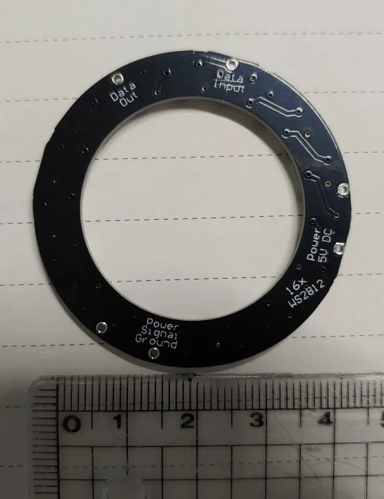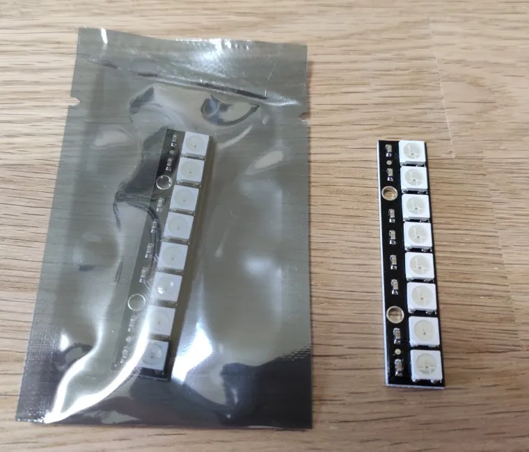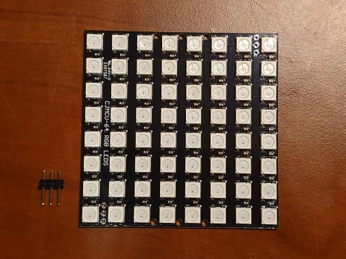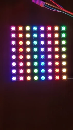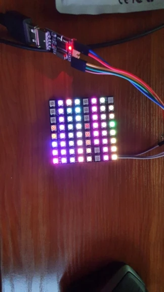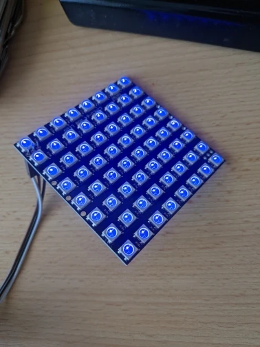 Works exactly as it should. The PCB size is 65x65 mm. LED pitch is approximately 8.14 mm horizontal, 8.29 mm vertical (so the pixel grid is not perfectly square, although the accumulated difference across 7 LEDs is about 1 mm).