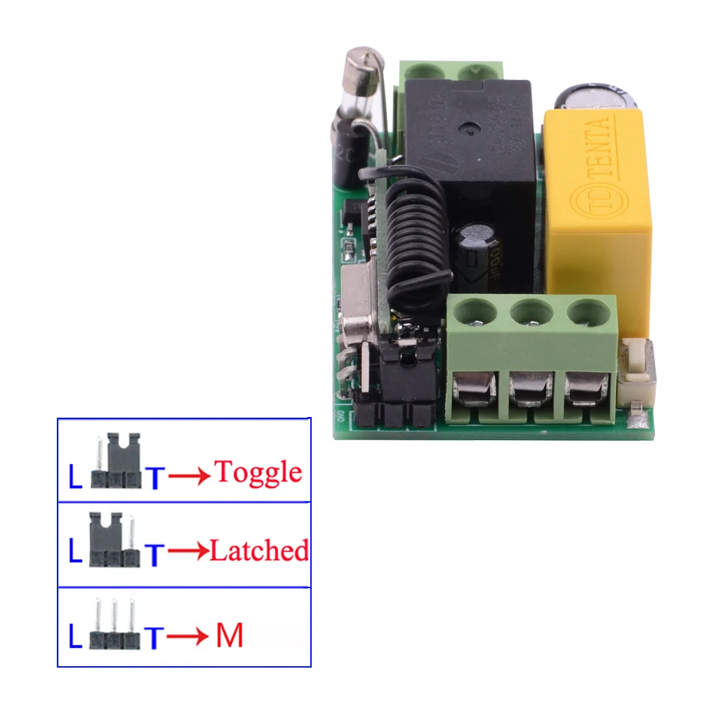 Тип кода: Обучающий код добавьте контроллер с помощью кнопки обучения на приемнике Выход Состояние: Мгновенный, переключаемый, свободно отрегулированный перемычкой.