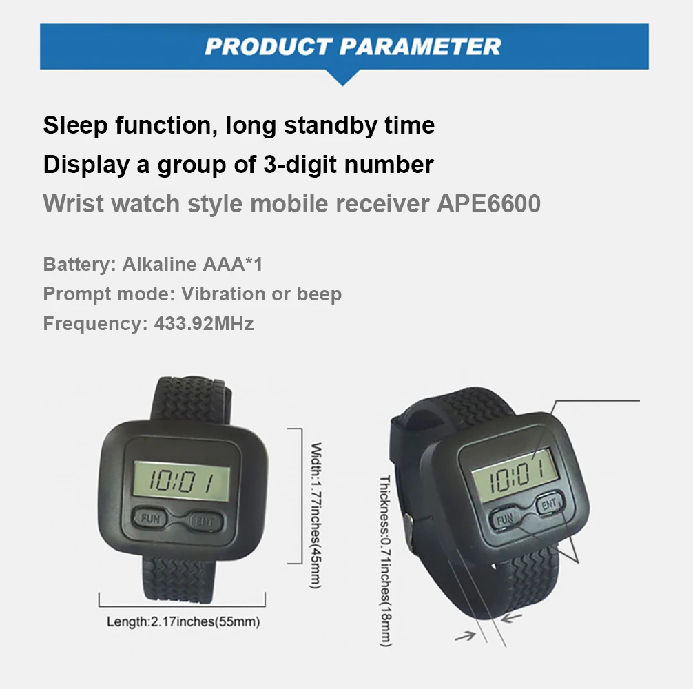 Беспроводная система вызова широко используется в области обслуживания. Это кнопка для использования гостем. Когда гость нуждается в какой услуге, он или она просто нажмите кнопку рядом с ним, его или ее номер стола будет отображаться в музыки или смотреть пейджер предупреждающий голос. Поэтому официант может обеспечить очень своевременное обслуживание. Это делает общение с гостями простым и эффективным. Добро пожаловать, чтобы выбрать наш приемник часов и кнопки вызова.