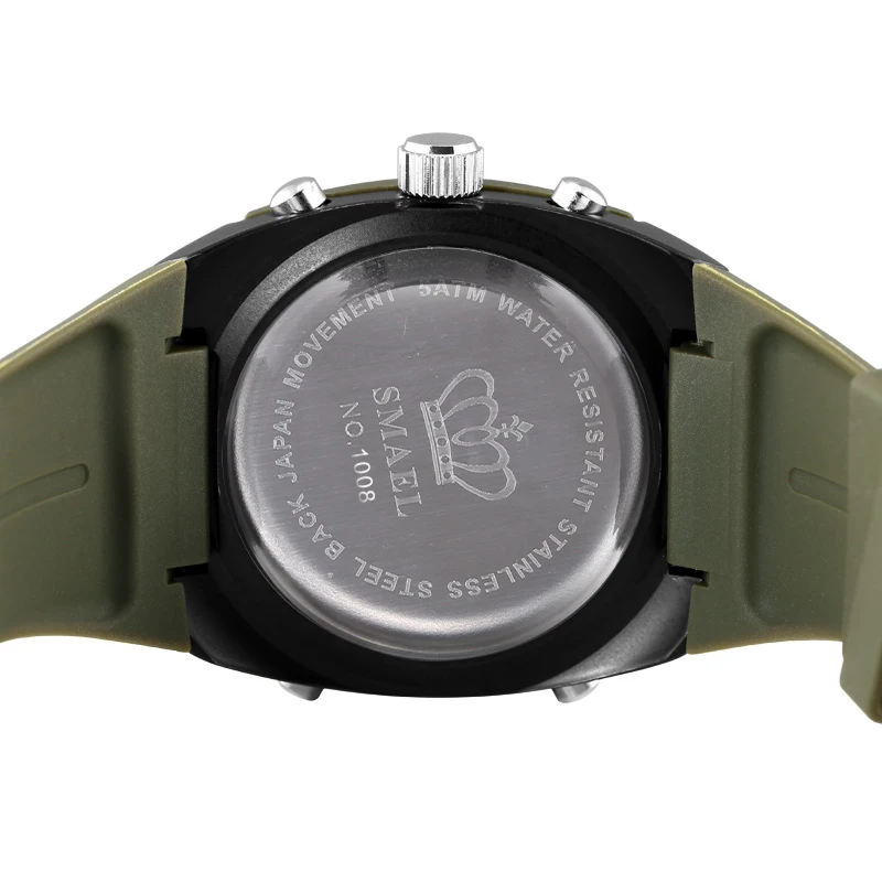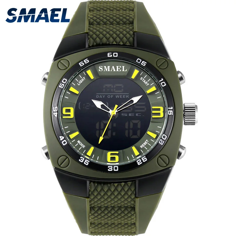 Часы SMAEL Мужские кварцевые с большим циферблатом, спортивные водонепроницаемые цифровые, в стиле милитари, армейские зеленые, 1008