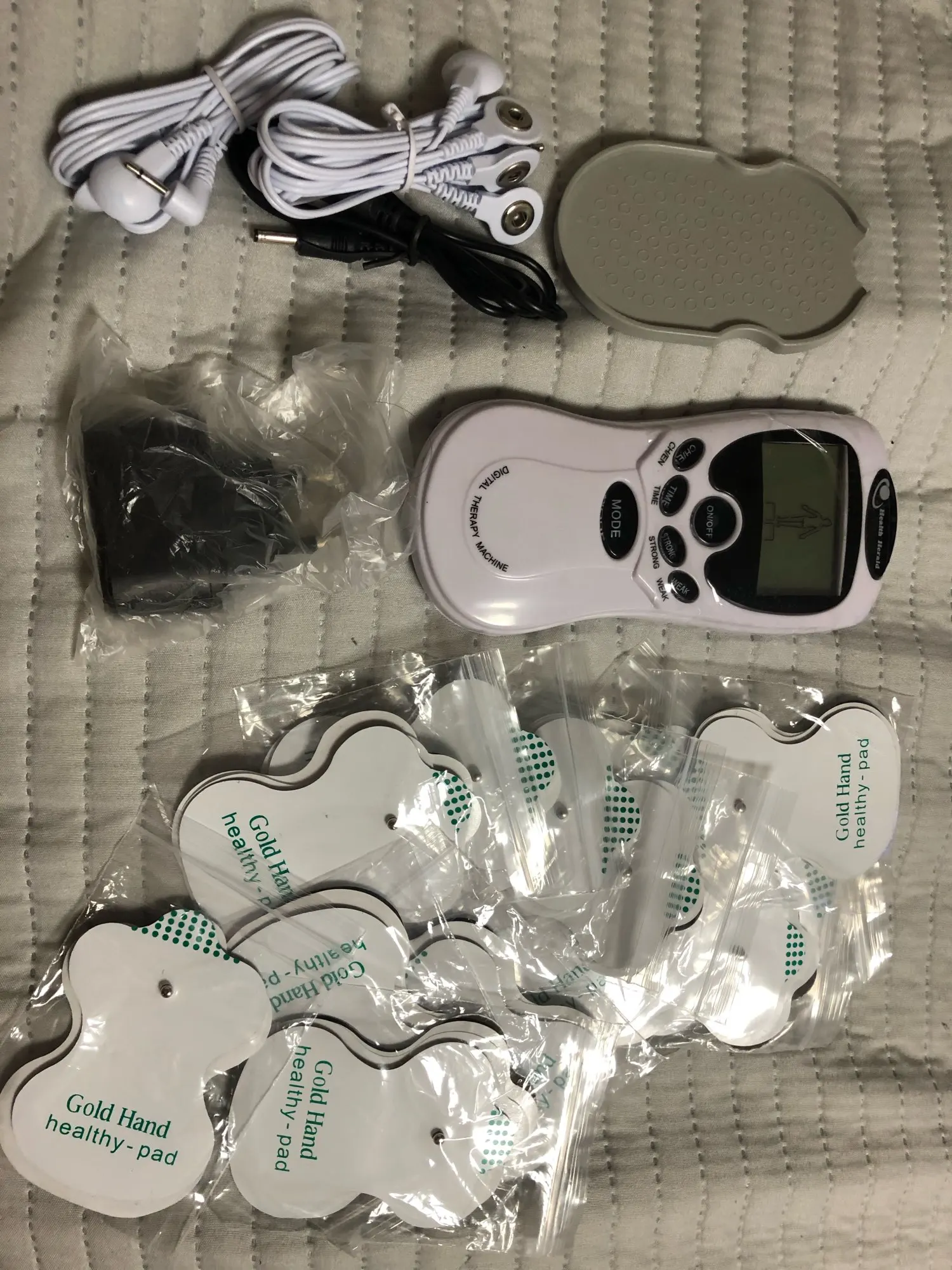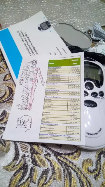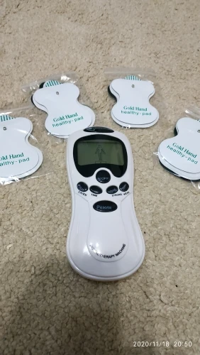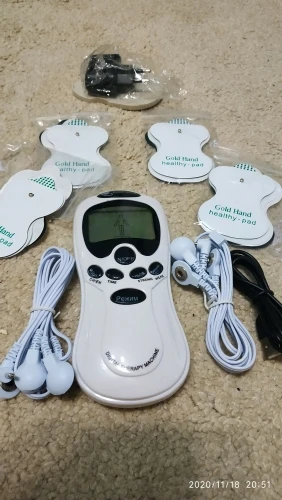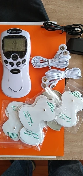 Доставка 3 дня. Соответствует описанию полностью - девайс, 8 подушечек, 2 выхода на 4, usb адаптер со шнуром, инструкция на английском, пластиковая подложка. Попробовал в работе от 3 мизинчиковых аккумуляторов - прикрепил 2 подушечки, чувствуется и на 1 уровне, на 3 - уже очень сильно.
