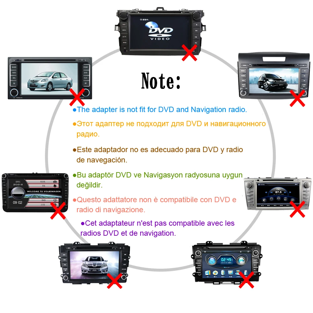 Обратите внимание, что адаптер не совместим с какой-либо навигацией, DVD и задней камерой, сенсорным экраном радио.