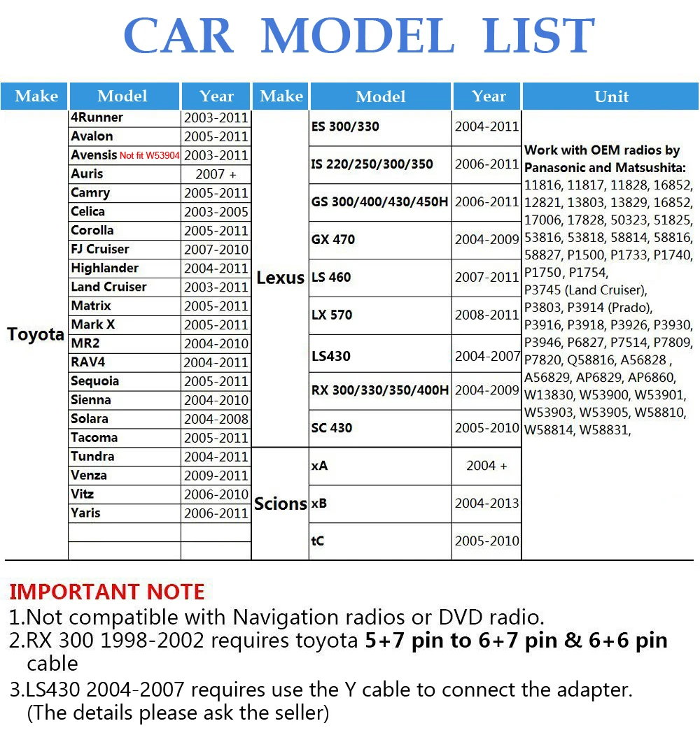(Не подходит для W53904)Camry 2005-2010,Celica 2003-2010,Corolla 2005-2011,FJ Cruiser 2007-2010,Highlander 2004-2010,Land cruiser 2003-2010(Без XM или 6-диск dvd-плеер),Матрица 2003-2010,MR2 2004-2010,RAV4 2003-2010,Sequoia 2005-2010,Сиенна 2004-2010,Solara 2004-2010,Tacoma 2005-2010,Тундра 2004-2010,Venza 2009-2010,Vitz 2006-2010,Yaris 2006-2010XA (2004 +), xB (2004-2013), tC (2005-2010)