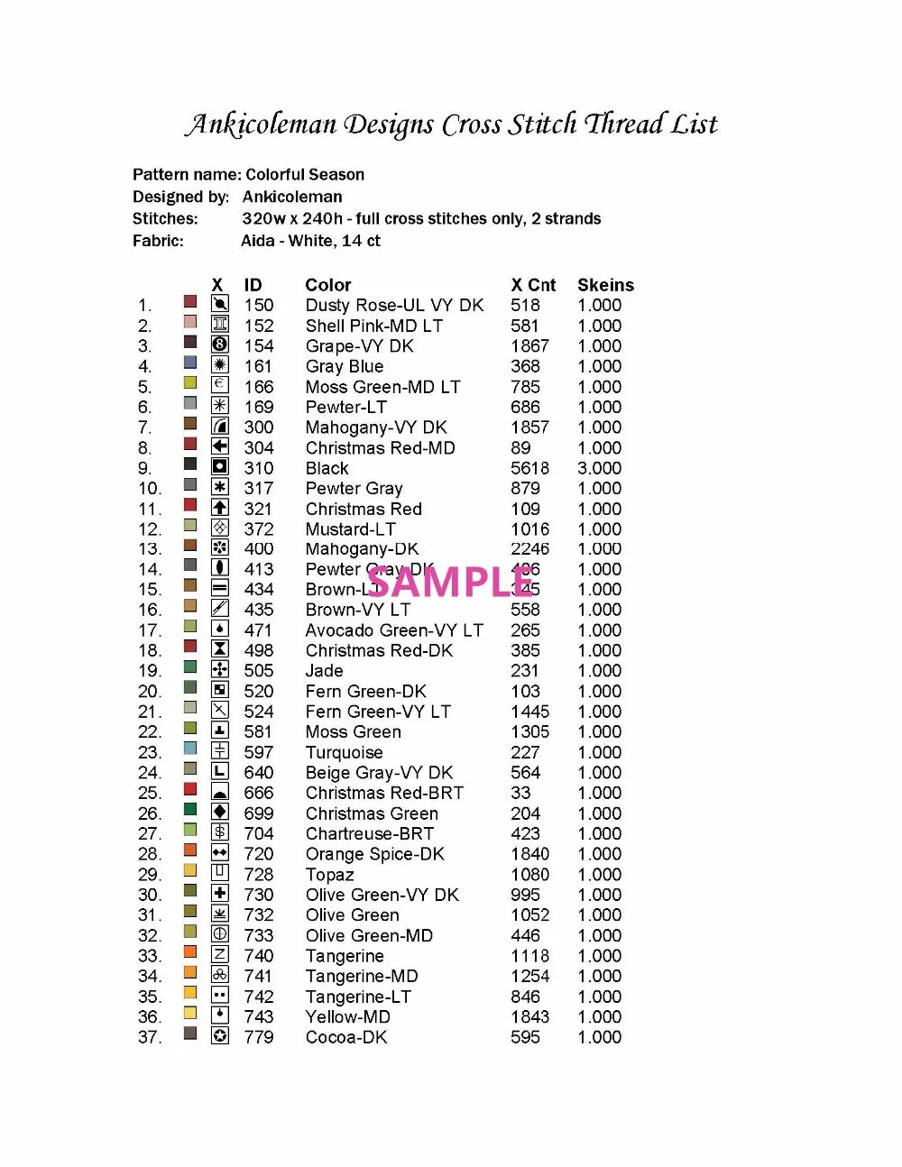 Цвета: 88(Предназначено для DMC floss); Использует однотонные нити, все стежки-полные стежки.